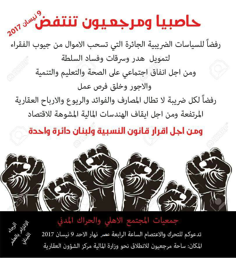 دعت جمعيات المجتمع الأهلي والحراك المدني في قضائي حاصبيا ومرجعيون إلى التحرك والإعتصام الساعة الرابعة عصر اليوم الأحد 9 نيسان 2017 في ساحة جديدة مرجعيون.
