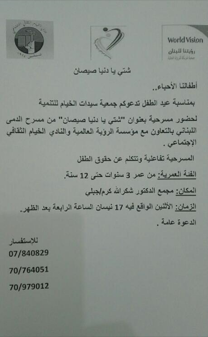 بمناسبة عيد الطفل، دعت چمعية سيدات الخيام للتنمية لحضور مسرحية بعنوان شتي يا دنيا صيصان من مسرح الدمى اللبناني بالتعاون مع مؤسسة الرؤية العالمية ونادي الخيام الثقافي الإجتماعي.