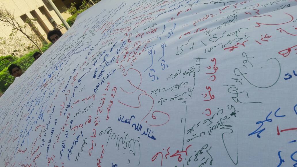 ثم كتب الحاضرون أسماء الأسرى على القماش.