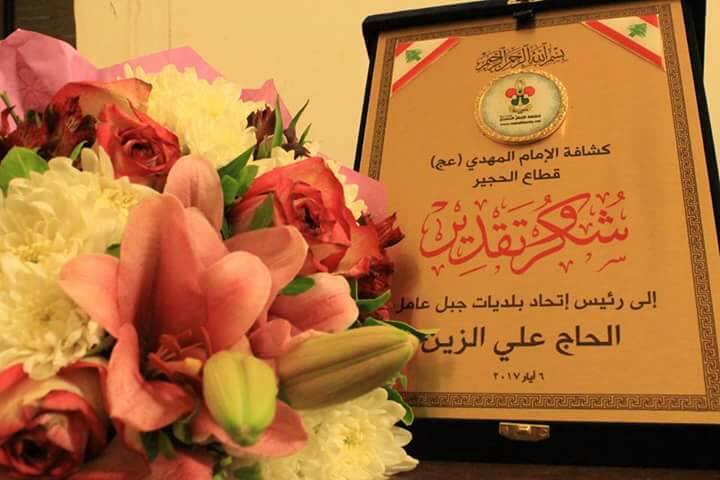 في أجواء ولادة الإمام المهدي (عجل الله تعالى فرجه) وإختتاماً لأنشطة العام 2016 التي أقامها قطاع الحجير في كشافة الإمام المهدي (عج) بالتعاون مع اتحاد بلديات جبل عامل اقام القطاع احتفالا كرم خلاله رئيس الإتحاد وتخلله فقرات متنوعة ابرزها عرض لتقرير إعلامي تضمن أبرز الأنشطة المنفذة، فقرات إنشادية وكلمة لرئيس اتحاد بلديات جبل عامل الحاج علي الزين، كلمة لعضو المجلس المركزي في حزب الله الشيخ علي زين الدين، واختتم بتكريم قيادة القطاع لرئيس الإتحاد