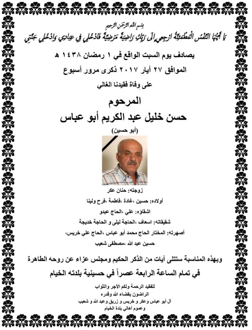 يصادف نهار السبت الواقع في ٢٧/٠٥/٢٠١٧ (الموافق الأول من رمضان) ذكرى مرور اسبوع على وفاة المرحوم حسن خليل عبد الكريم أبوعبّاس (أبو حسين)..