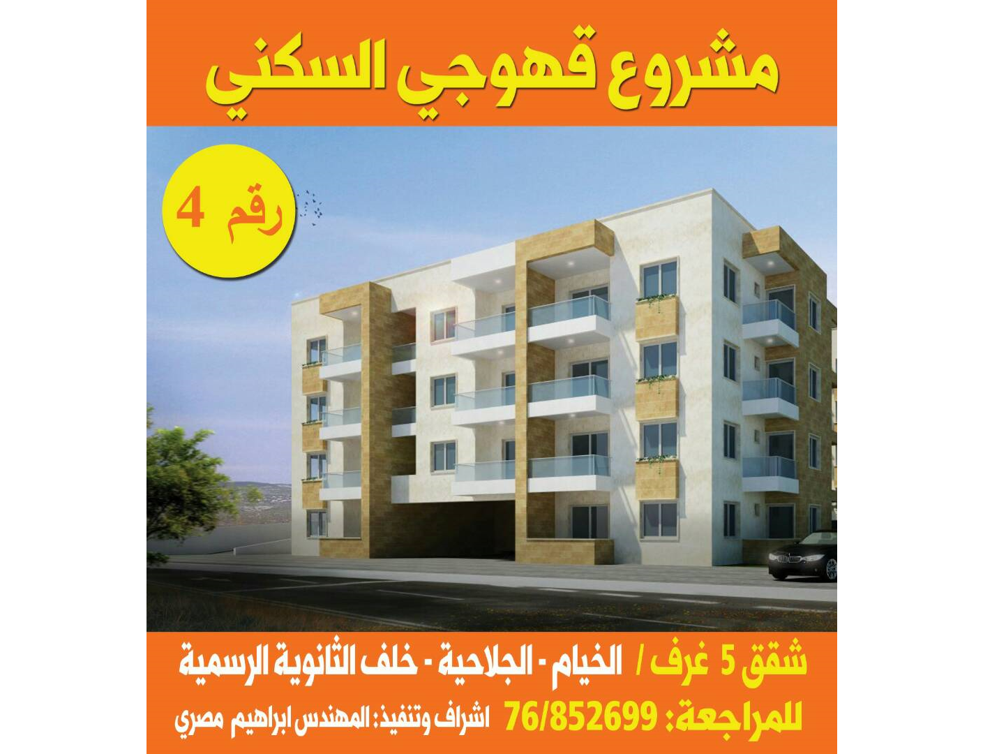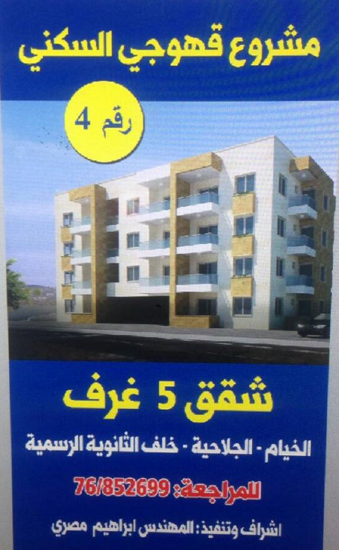 بعون آلله وتوفيقه، وبعد النجاح الملفت التي حققته مشاريع قهوجي رقم /1/2/3 وما تميزت به من إتقان في العمل وجمالية في التصاميم وسرعة في التنفيذ والذي لاقى استحسانا لدى أصحاب الشقق وأهالي الضيعه الكرام عادت لتطل من جديد عبر اعلانها عن مشروعها الرايع بإذن الله والذي سيقام بالقرب من ثانوية الخيام في الجلاحية على تلة جميله ورائعة، مشرفه ولا تُحجب.