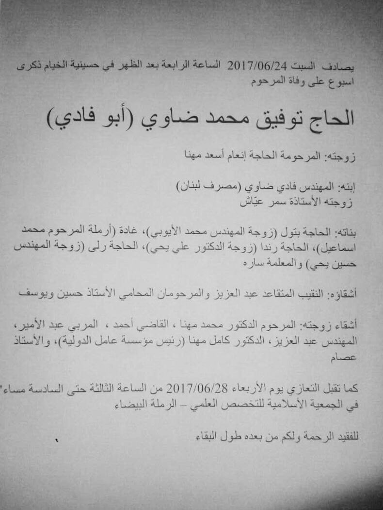 يصادف نهار السبت الواقع فيه 24 حزيران الجاري ذكرى مرور اسبوع على وفاة المرحوم عدنان ابراهيم طويل (أبو منح)، الحاج توفيق محمد ضاوي (أبو فادي) والمحامي نزيه حسن عواضة (أبو وسام).