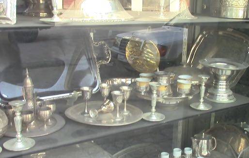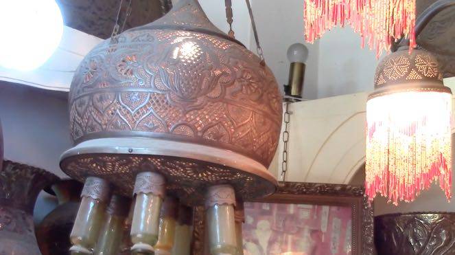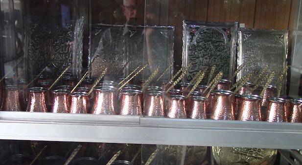 يعج محل سليم حسون بالأغراض النحاسية، لكن جلها أبيض لماع، فهو مطعم بالفضة، ومنه الركاوى التي منها ما هو مفضض، ومنها النحاسي اللماع على حمرة.