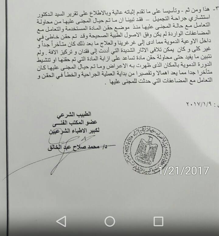 وذكرت أنها أصيبت بالفزع نتيجة تشوه شكلها، وهو ما أثر على حالتها النفسية، وبالفعل التحقت بأحد المستشفيات للعلاج النفسي من الصدمة، وأكدت أنها لم تسكت عن حقها، وتوجهت على الفور لنقابة الأطباء، وقدمت شكوى ضد الطبيب حملت رقم 192 لسنة 2017، وأيضاً قامت برفع دعوى قضائية ضده، انتهت بصدور حكم بحبسه سنة، وهي أقصى وأقسى عقوبة في قضايا الجنح، وهو ما يعني تأكد المحكمة من ثبوت خطأ وتجريم الطبيب.