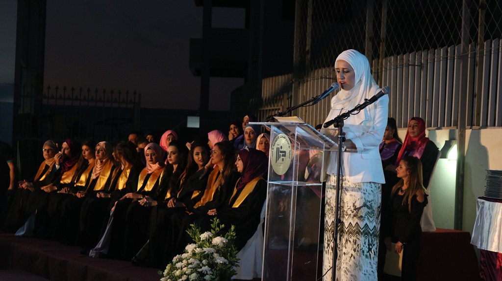 وألقت مديرة الجمعية السيدة مي حاسبيني كلمة قالت فيها: نقف هنا مراراً وتكراراً بشحنة مضيئة حباًّ وطاقة لننطلق نحو تحقيق الآمال ونيل المبتغى، نرسم الابتسامة على وجوه المتخرجين ، وعلى مُحيّى الأمهات والآباء، نجعل عيون الأبناء أكثر بريقاً، ودموع الأهل أكثر فرحاً.