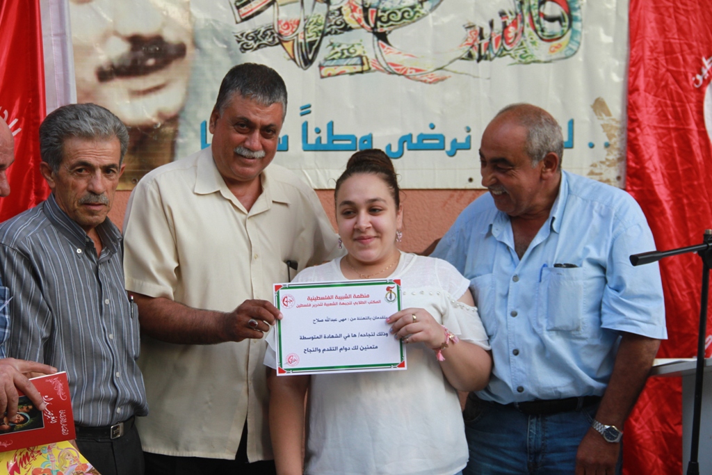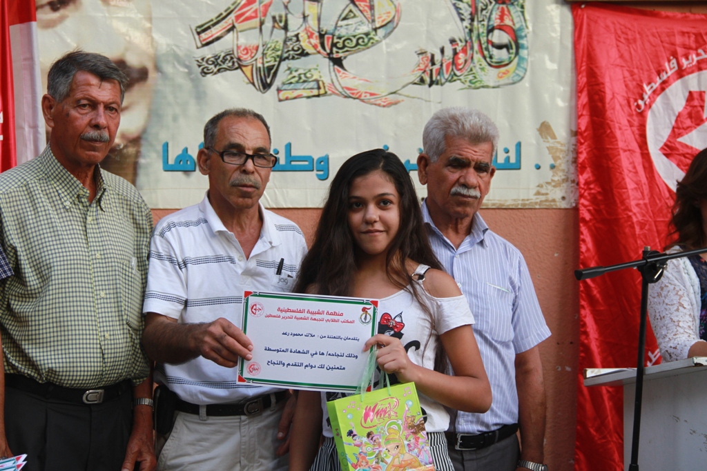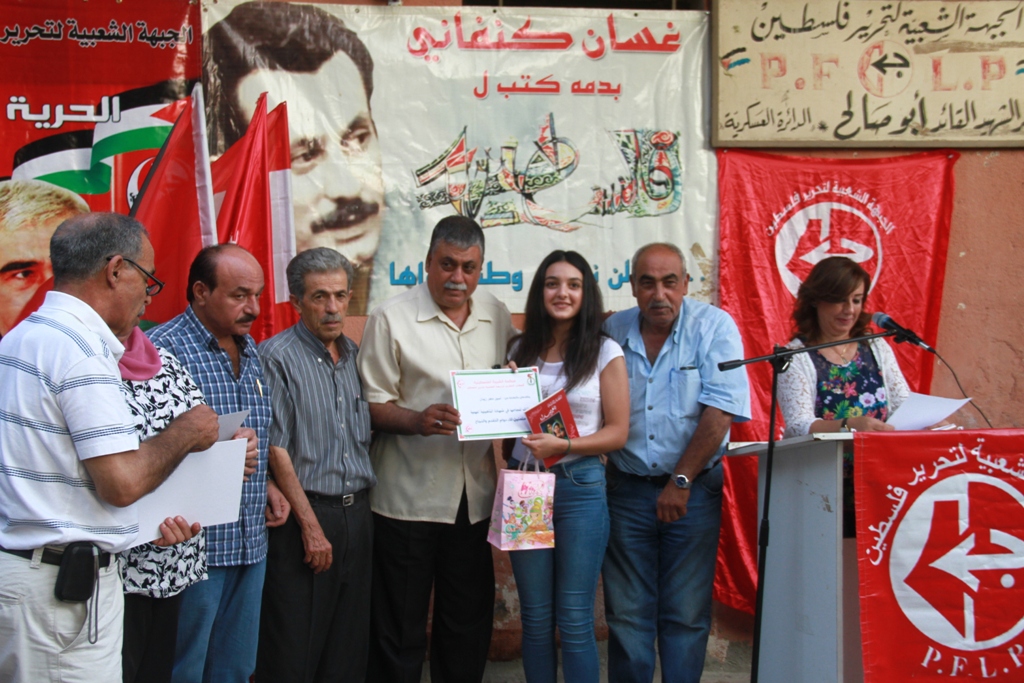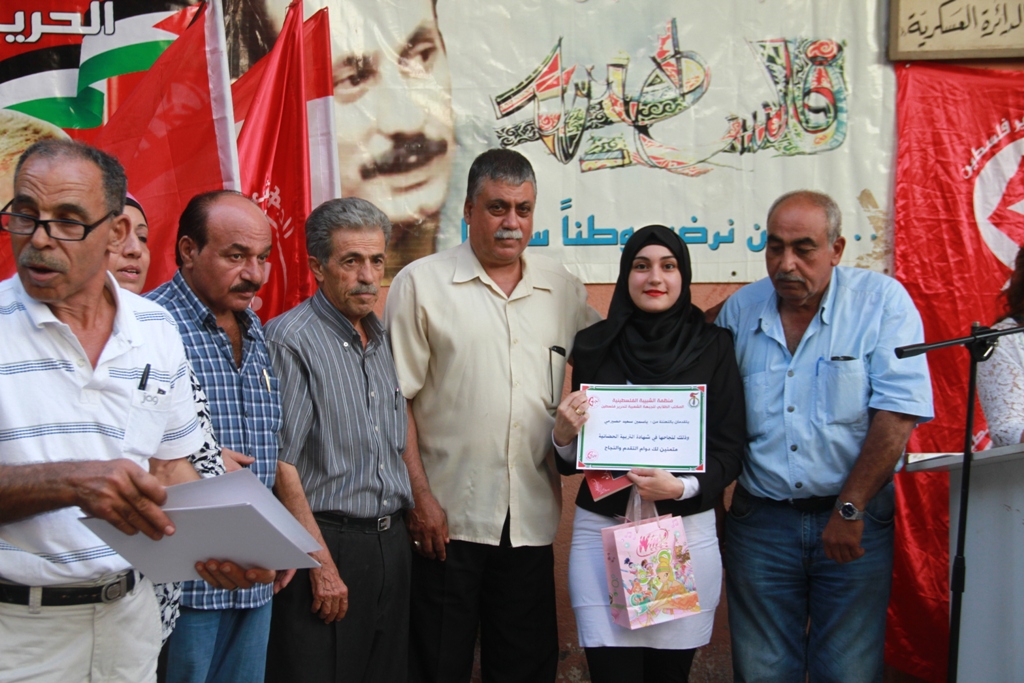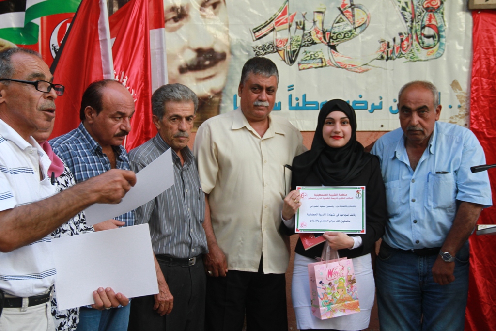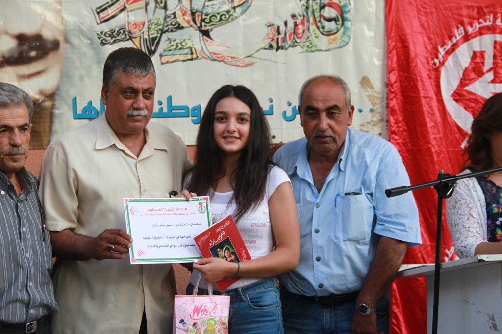 علهم يحققون ما عجز عنه غيرهم، وعلهم يعطون للشهداء حقهم، علهم يفتخرون بأبنائهم و أحفادهم، وعسى فلسطين تفرح يوما بما أنجبت من أبناء ناجحين مثابرين، وفي نهاية كلامها وجهت التحية للجبهة الشعبية لتحرير فلسطين، لرعايتها الدائمة لأبنائها و أبناء الشعب الفلسطيني، وعاهدتها أن يبقوا طالبي علم مثابرين على النجاح حتى تحقيق حلمنا بالحرية و العودة، وختمت بتوجيه التحية للأسرى والوفاء للشهداء ولفلسطين .