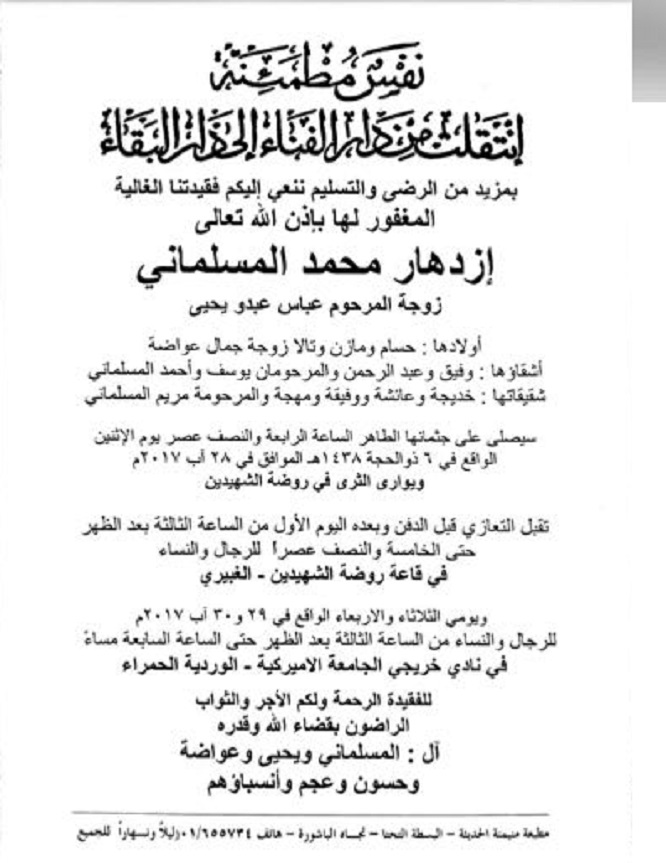 تقبل التعازي يومي الثلاثاء والأربعاء في 29 و 30 آب الجاري من الثالثة عصراً لغاية السابعة مساءً في نادي خريجي الجامعة الأمريكية في بيروت - الحمرا الوردية