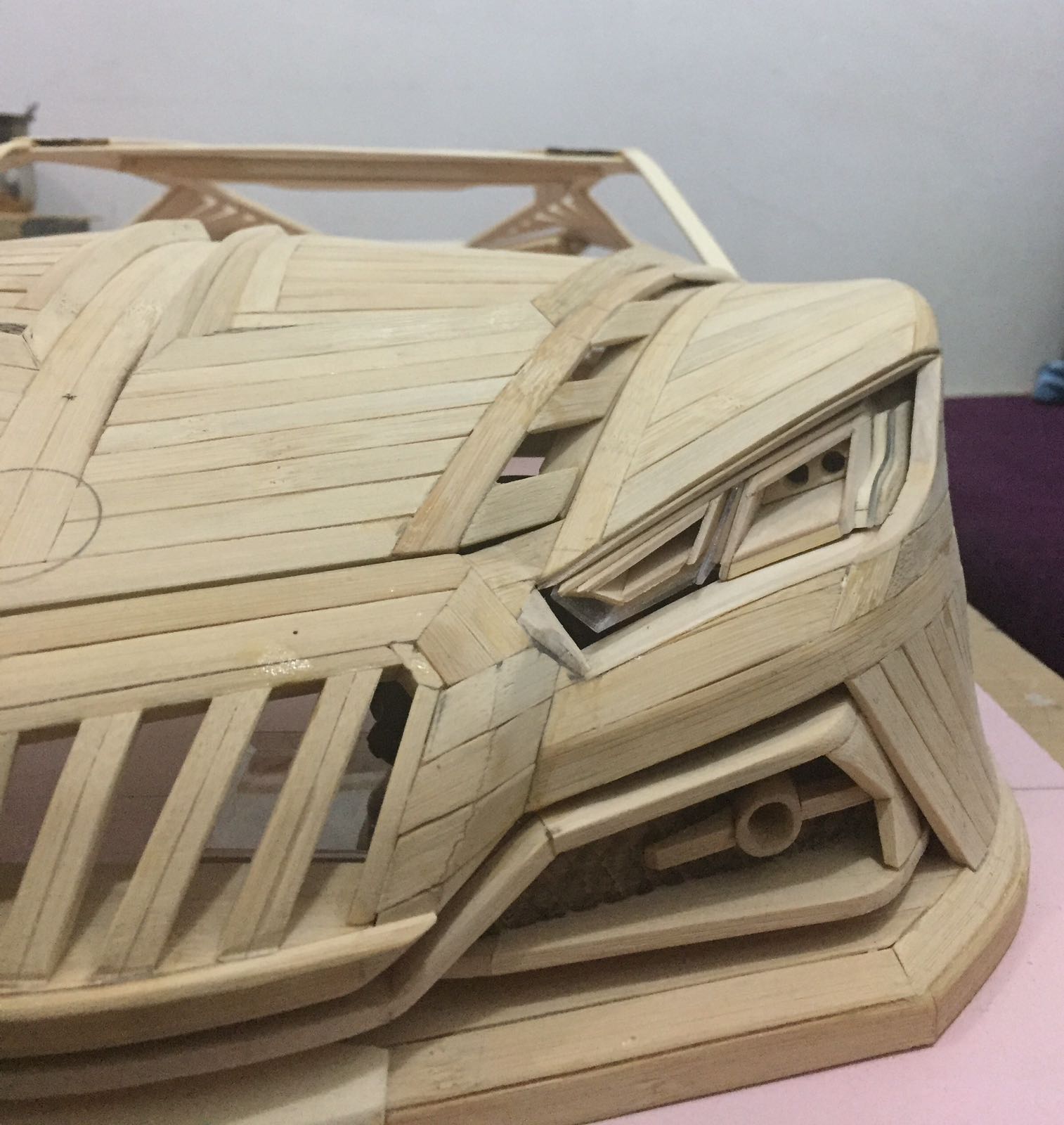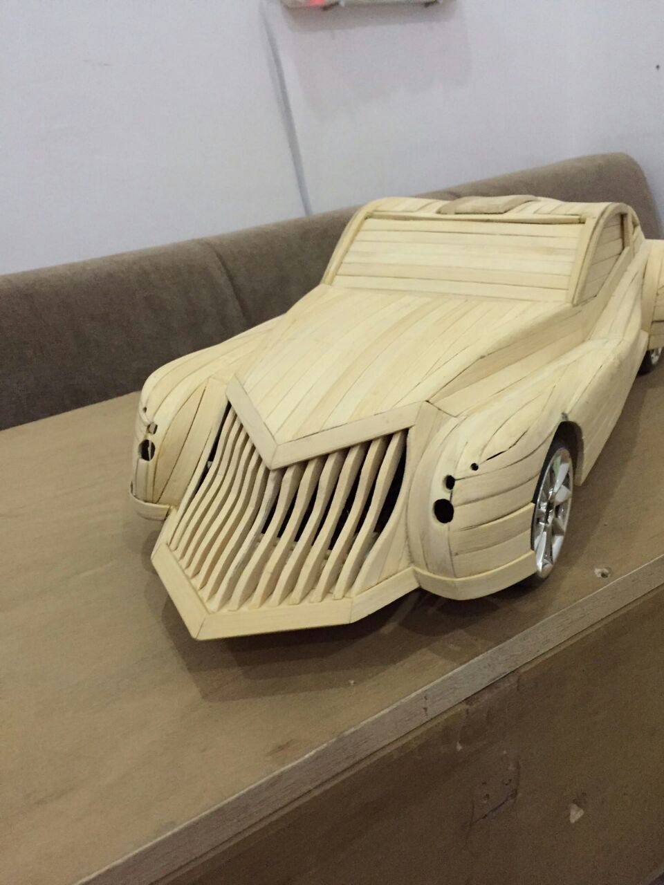 لكنه أصر على صقل موهبته أكثر فأعتمد عام 2009 اعواد القش وصنع حتى الان 6 سيارات بقياسات مختلفة وبتصاميم مميزة من خياله ، دون غفلان أقل التفاصيل وأدقها حتى تخالها حقيقية وكل سيارة تستلزم من شهرين حتى عام كامل من العمل بأوقات الفراغ لتخرج تحفة فنية تستحق التقدير .