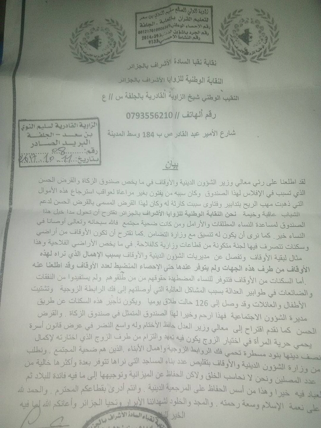 ونقل موقع "الشروق أون لاين" عن بيان لهذه النقابة قولها :"نطلب من وزارة الشؤون الدينية تقليص عدد مشاريع المساجد التي نراها تتوفر بكثرة وأغلبها خاوية ..".