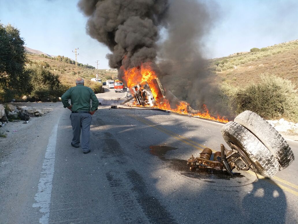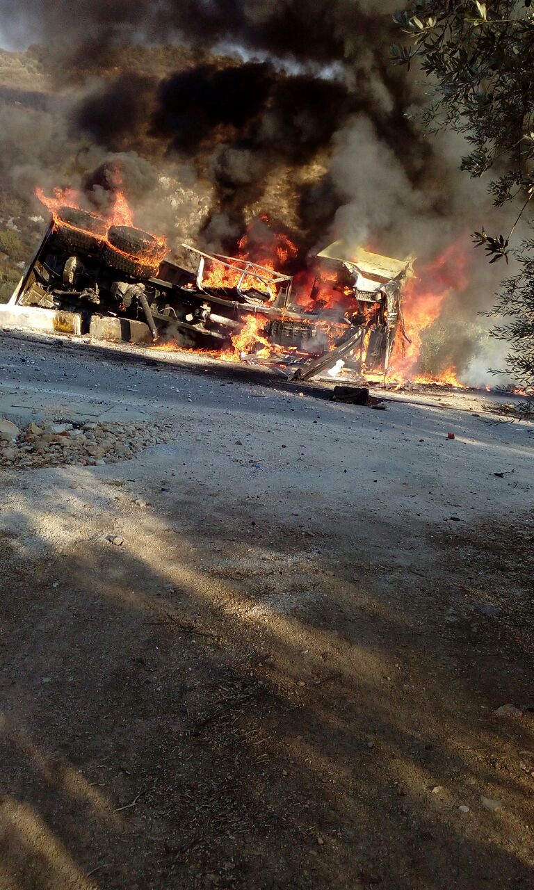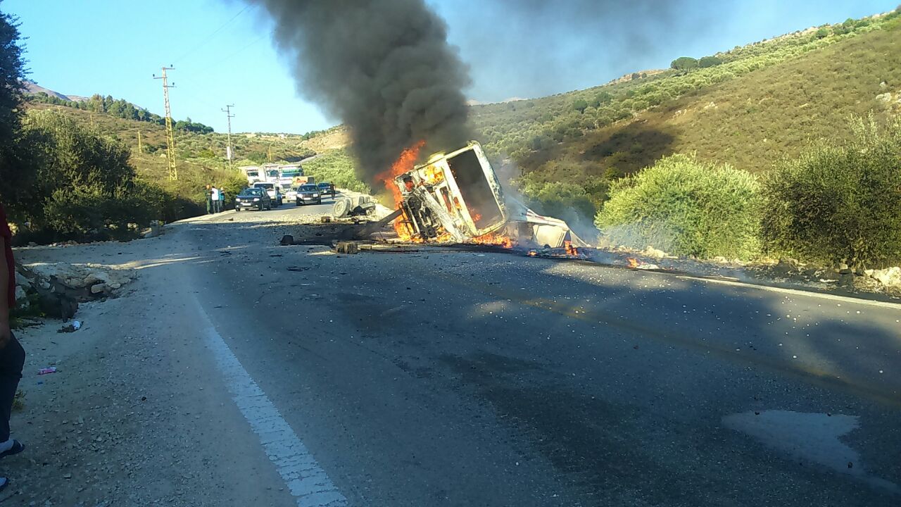 انقلبت شاحنة في محلة عين تنورة - الحاصباني، يقودها المواطن أ.عواضة من بلدة الخيام، بعد ان انحرفت عن الطريق مما أدى الى اشتعال النيران فيها.