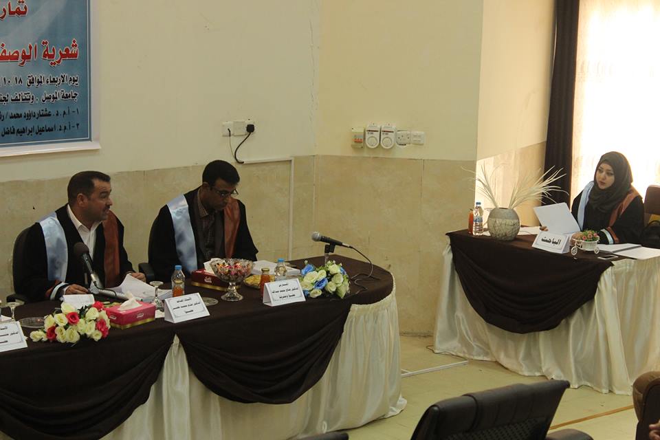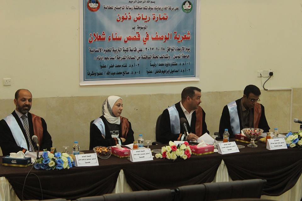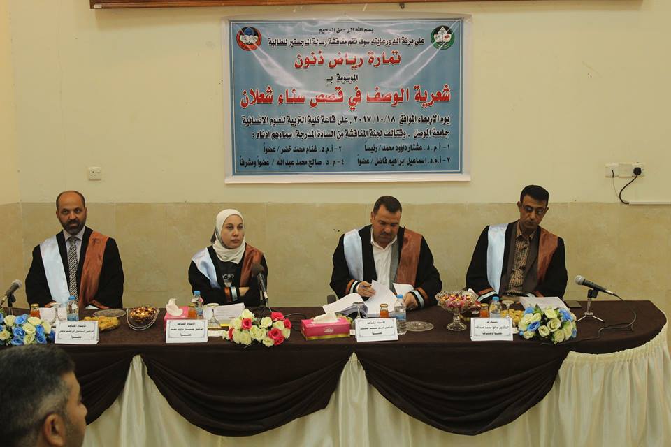 وقد أشرف على الباحثة في رسالتها هذه الدكتور صالح محمد عبدالله العبيدي من جامعة الموصل،في حين تكونت لجنة المناقشة من كل من:أ.م.د.عشتار داؤود محمد/رئيساً،وأ.م.د.إسماعيل إبراهيم فاضل/عضواً،وأ.د.م.غنام محمد خضر/عضواً،وم.د.صالح محمد عبد الله/عضواً ومشرفاً.