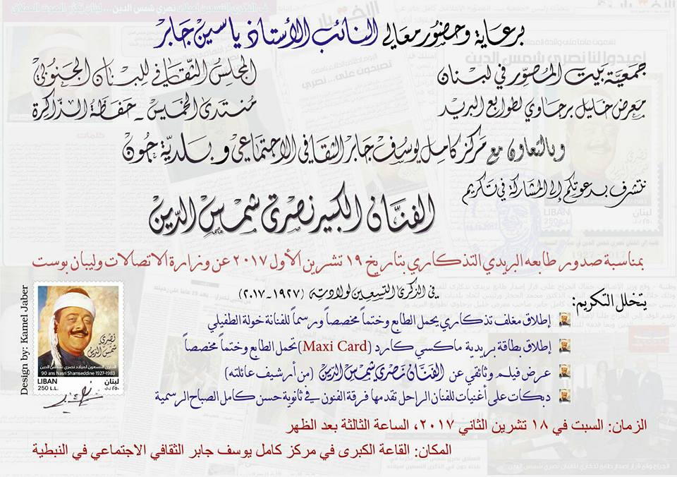 ينطلق من عاصمة جبل عامل، مدينة النبطية تكريم آخر للفنان نصري شمس الدين يتمثل بإقامة حفل متنوع يتخلله، إطلاق جمعية بيت المصور في لبنان ومعرض خليل برجاوي لطوابع البريد مغلف تذكاري وبطاقة بريدية (ماكسي كاردMaxi Card ) كذلك من تصميم كامل جابر ورسم (المغلف) الفنانة خولة الطفيلي، ويحملان الطابع البريدي مع ختم خاص، فضلاً عن عرض فيلم وثائقي وتقديم رقصات ودبكات على أغنيات نصري.... بالتعاون مع المجلس الثقافي للبنان الجنوبي ومركز كامل يوسف جابر الثقافي الاجتماعي وبلدية جون ومنتدى حفظة الذاكرة... بتاريخ 18 تشرين الثاني 2017، في مركز كامل جابر في مدينة النبطية...