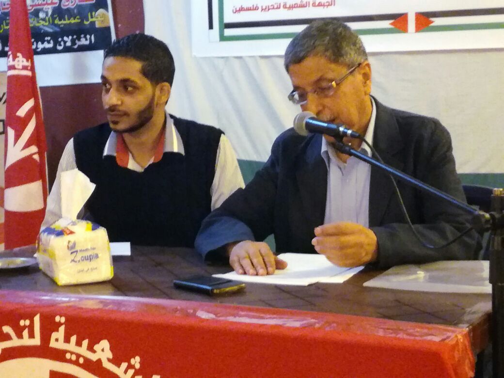 واستهل الأستاذ جابر سليمان مداخلته بالتعبيرعن اعتزازه بوجوده بين أهله وشعبه في مخيم البرج الشمالي، كما توجه بالشكر للجبهة الشعبية لتحرير فلسطين.