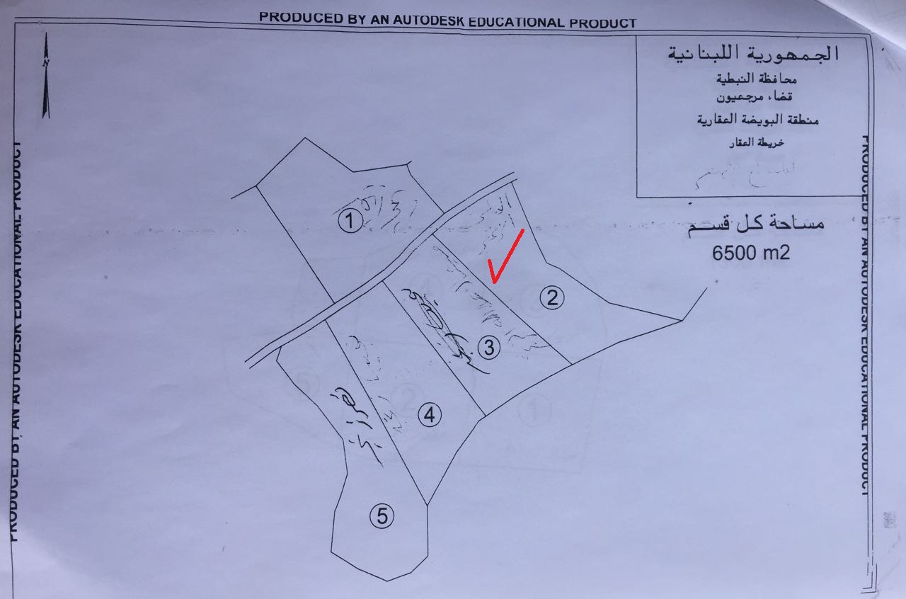 معروض للبيع قطعة أرض صفيرة كائنة بمحلة البويضة في منطقة جديدة مرجعيون العقارية، هي القسم 2 من العقار رقم 942 الظاهر في مشروع الإفراز المبيّن في الصورة.