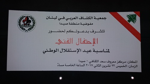 اختتمت مفوضية منطقة صيدا في جمعية الكشاف العربي في لبنان برنامج احتفالاتها بعيد الاستقلال لهذا العام بحفل فني وطني أقيم في مركز معروف سعد الثقافي في صيدا.