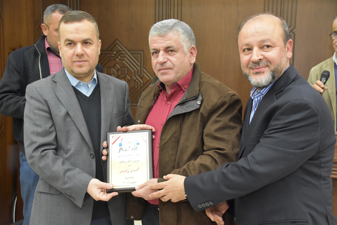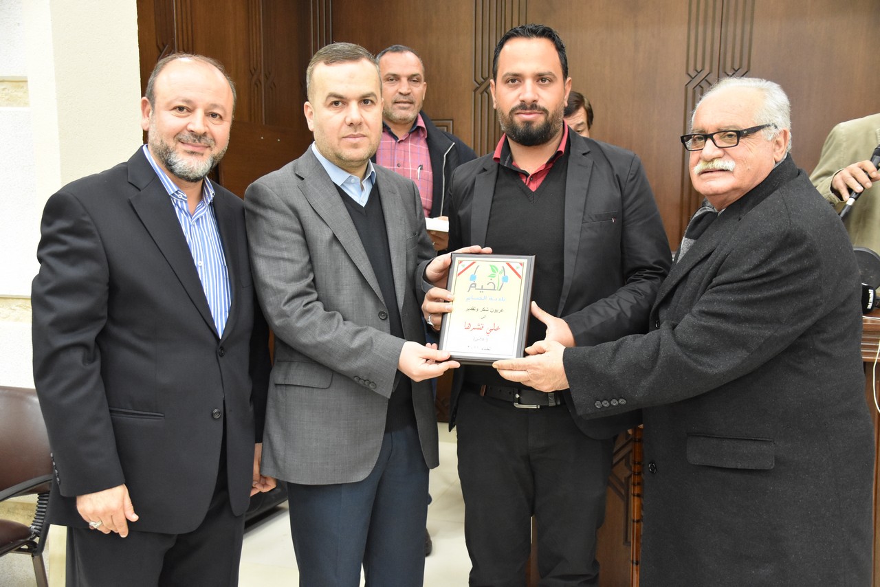 وختام الكلمات كانت للكاتب والمحلل السياسي يونس عودة الذي تحدث باسم الإعلاميين المكرمين قائلاً إن الإعلامي هو في الأصل كالجندي ليس طالب شهرة، وإن أتت فلا بأس بها، ولكنها لا يجب أن تكون غاية، لأن الشهرة كالطوق، فهو جندي في معركة مستمرة، وفي المحطات الوطنية يجب أن يكون أكثر انتماءً وصلابة، فلا تغريه المغريات، ولا وعود الساسة، ولا السقوط في حبائل الإغراء، بل يجب أن يكون وطنياً يقاوم كل المظالم.