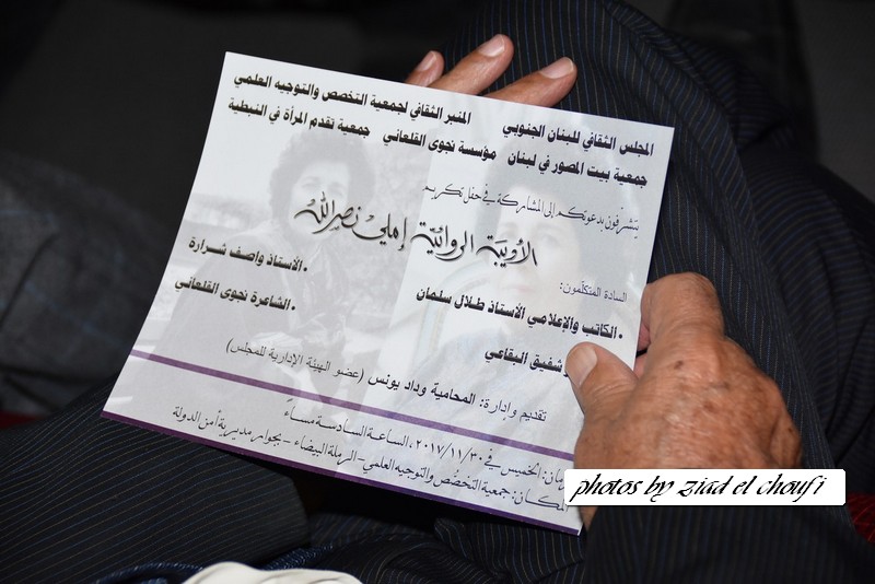 كثيرون حضروا من الجنوب والبقاع وبيروت، وحضر الأصدقاء وفي مقدمتهم المفكر والكاتب كريم مروة والإعلامي الكاتب طلال سلمان والشاعر شوقي بزيع وحشد كبير من الفاعليات الثقافية والسياسية والاجتماعية والتربوية، ومن رفاق الدرب… بدعوة من المجلس الثقافي للبنان الجنوبي والمنبر الثقافي لجمعية التخصُّص والتوجيه العلمي، وجمعية بيت المصور في لبنان، ومؤسسة نجوى القلعاني، وجمعية تقدم المرأة في النبطية.