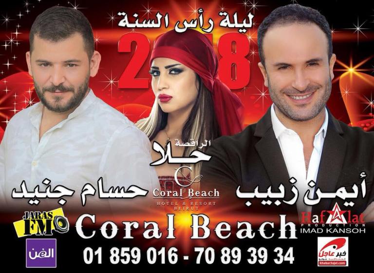 يحيي الفنانان أيمن زبيب وحسام جنيد حفلاً فنياً في كورال بيتش - بيروت بمناسبة رأس السنة الجديدة، كما ستشارك في الحفل الراقصة حلا.