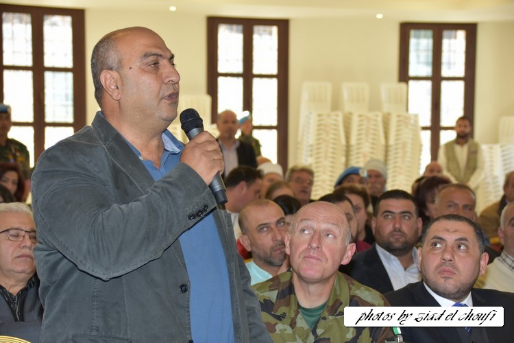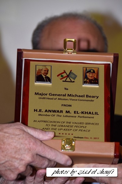 اضاف: "نلتقي اليوم في هذا اللقاء التكريمي، بعد إجتماع عمل جمع، الى اللواء مايكل بيري وفريق عمله، مختلف فاعليات المجتمع الحاصباني، لنؤكد على موقف كتلة التنمية والتحرير برئاسة رئيس مجلس النواب نبيه بري، الحريص دائما على أفضل العلاقات مع القوات الدولية، وقد أوردت في مطلع هذه الكلمة النص الحرفي لموقفه الإيجابي جدا من هذه "القوات". ولا شك بأن الإجتماع سيشكل بداية مرحلة جديدة من التعاون المثمر الذي سيأخذ بعين الإعتبار خلاصة اللقاء الهام الذي عقد قبل ظهر اليوم في دار حاصبيا، والذي أترك الحديث عنه للسيد اللواء بيري".