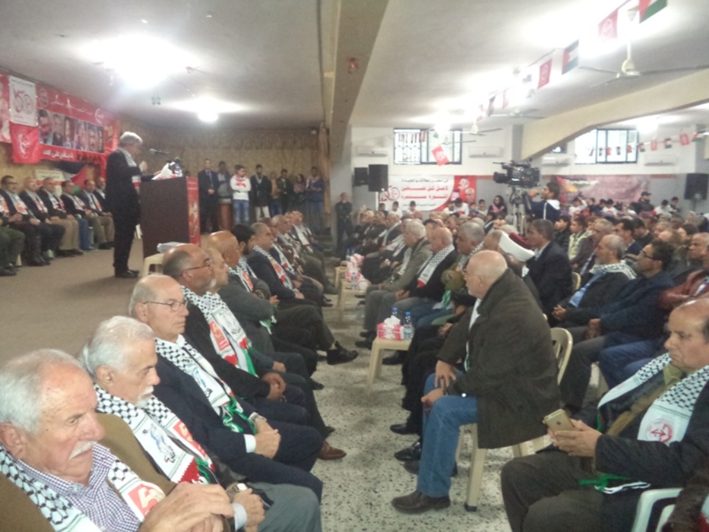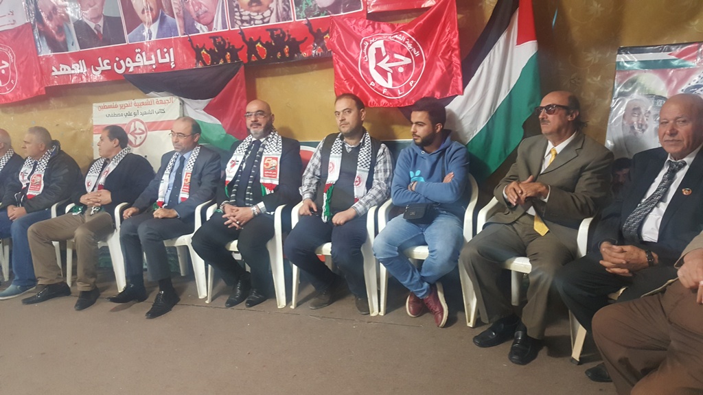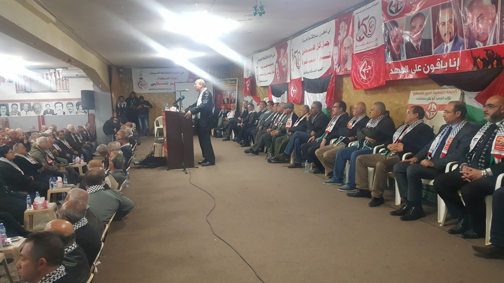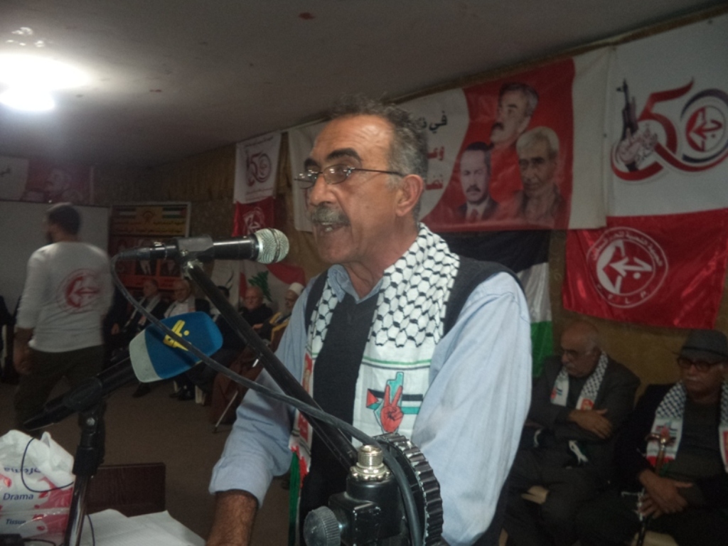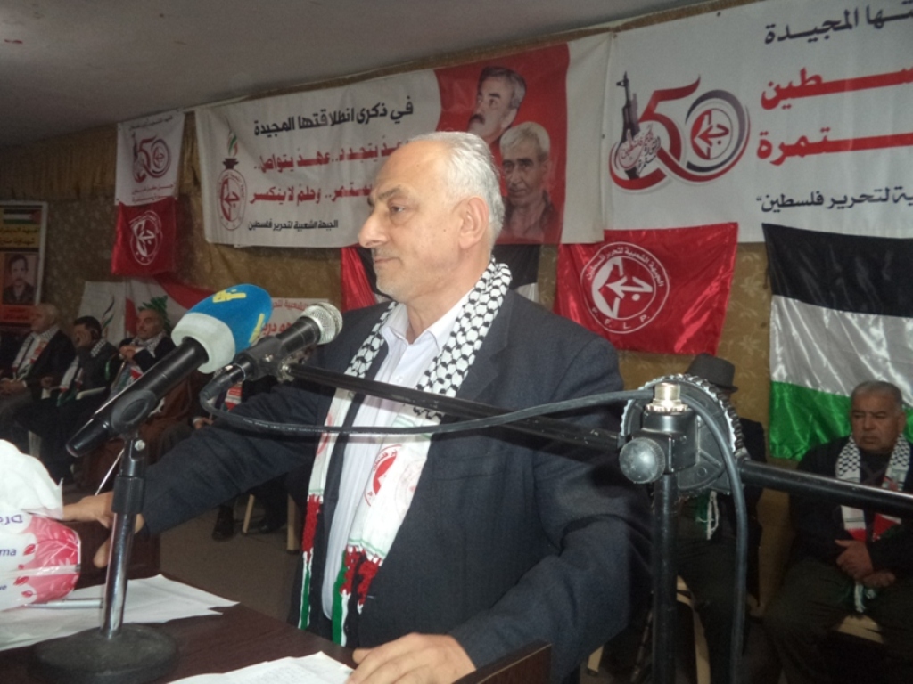 مشيرًا في كلامه إلى أن الخطر الصهيوني لا يمس فلسطين فحسب، بل يمس الأمة بأسرها، و ها هي الجماهير العربية خرجت بأغلبية العواصم العربية ، لتؤكد ارتباطها العميق والوثيق بالقضية الفلسطينية، على رغم تواطؤ النظام الرسمي العربي، لذلك لا بد من استعادة البعد العربي، والقومي للقضية الفلسطينة. كما أشار إلى أن الجبهة الشعبية ربطت ما بين التحرر و المضمون الاجتماعي، فالثورة حتى تنتصر، فهي تعتمد على أبناء المخيمات، على الفقراء، على الكادحين، والمسحوقين المرتبطين بالثورة، وأهداف الثورة حتى النهاية، لأنه أمام هذا الوضع الصعب يتضح أن هناك استحالة للوصول إلى حل سياسي مع هذا الكيان. وبعد قرار ترامب، نقول: إن أمريكا لم تعد وسيطًا نزيهًا ، وهي لم تكن في يوم من الأيام وسيطًا نزيهًا، مشيرا إلى أن الجبهة الشعبية تريد توحيد الصفوف، مؤكدًا على أن هذا الكيان الصهيوني، يقوم بالقضاء على الشعب الفلسطيني بأكمله، مشيرا إلى ضرورة ترميم البيت الفلسطيني، من خلال الإعلان الواضح والصريح بإلغاء اتفاقات أوسلو، وكل ما ترتب عنها من نتائج و مصاعب، وعلى السلطة أن تدفن اتفاق أوسلو الميت، وسحب الاعتراف بالكيان الصهيوني، والاعتراف بإسرائيل من قبل السلطة الفلسطينية، كما يجب على الشعب الفلسطيني أن يعمل على أساس انتفاضة فلسطينية جذرية، متواصلة، وتشكيل قيادة وطنية موحدة، انتفاضة من كافة الفصائل الفلسطينية من دون استثناء، وممارسة كل أشكال النضال حتى نوصل الكيان الصهيوني لقناعة أن استمرار احتلاله لأرضنا مكلف بشريا واقتصاديا، وأنه ليس أمامه إلا الرحيل، وإعادة الاعتبار لمنظمة التحرير الفلسطينية، وإعادة بناء مؤسساتها، وكل ما ينبثق عنها من أطر، لكي نستنهض طاقات 6.5 مليون فلسطيني في الشتات الذين يشعرون بأنه ليس لديهم مرجعية، ولا وجود لمن يحميهم، والعمل على عقد مجلس وطني شامل، بعيدا عن سطوة الاحتلال، وليس في رام الله، تشارك فيه كل القوى من دون استثناء، استعادة الوحدة الوطنية الفلسطينية الحقيقية، و ببرنامج يعيد الاعتبار لمعنى فلسطين من النهر إلى البحر، لا شرعية لهذا الكيان على أي بقعة من فلسطين.