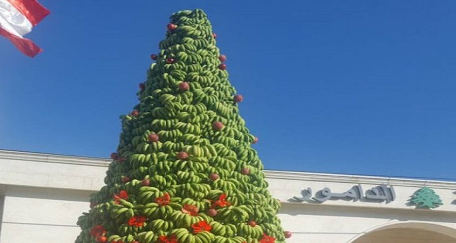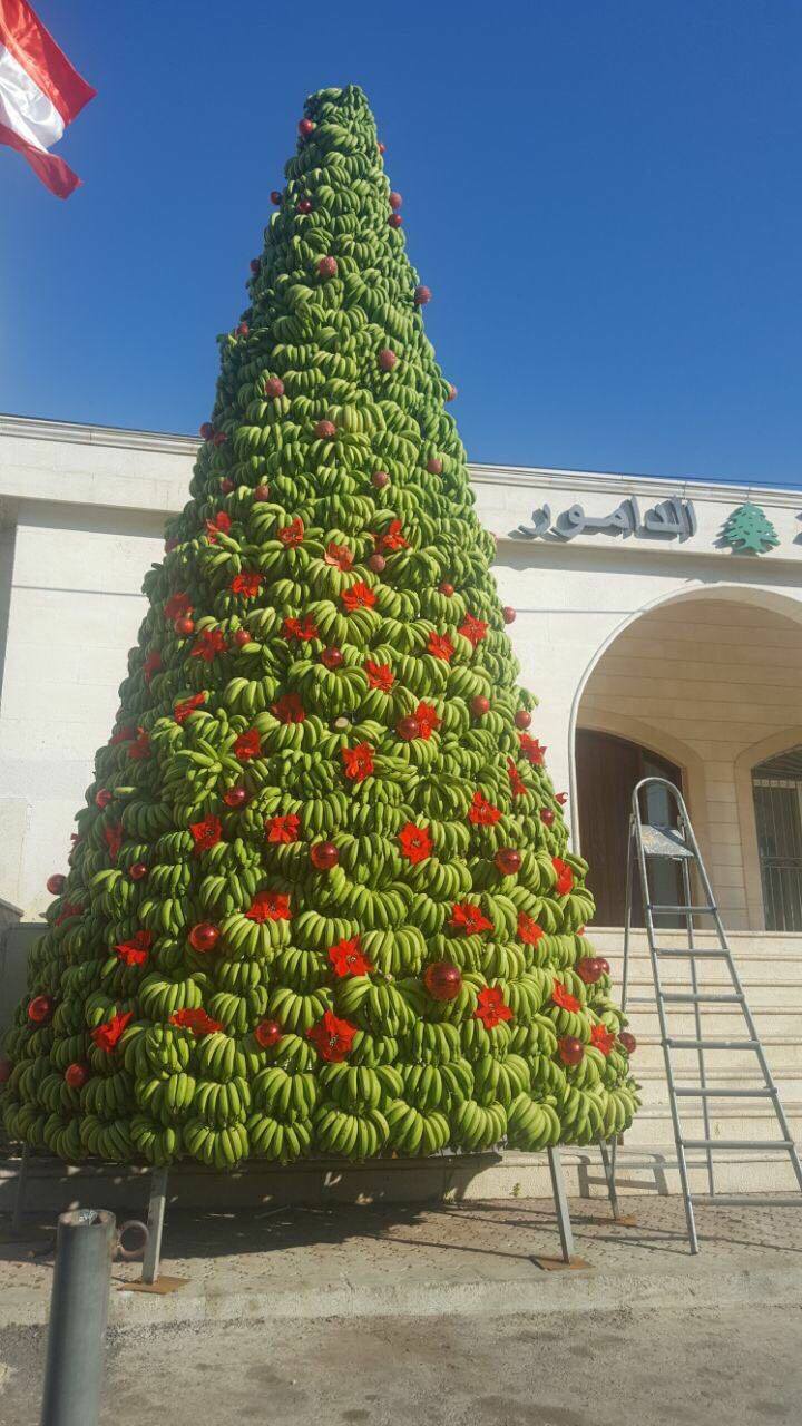 رفعت بلدية الدامور بمناسبة عيد الميلاد، امام مبناها البلدي، شجرة ميلاد مصنوعة من فاكهة الموز، بإعتبار الدامور الساحلية تشتهر بزراعة الموز.