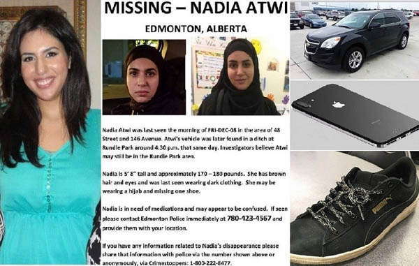 وخصصوا لنادية عطوي صفحة في "فيسبوك" باسمها، ترويجا لحملة بدأت تشمل معظم ولاية Alberta للبحث عنها فيها "وتم استخدام عدد من طائرات "الدرون" من دون طيار، للبحث في الأرياف والمشاعات" بحسب الوارد بموقع شبكة cbcbNews التلفزيونية، وما زالوا يستخدمون "الدرون" كل يوم، آملين بالعثور على ما يبدو أنه مهمة صعبة.