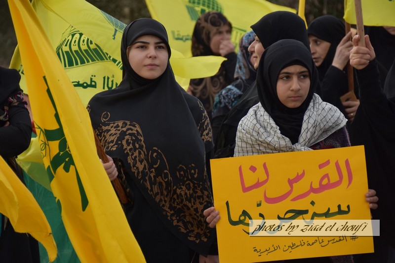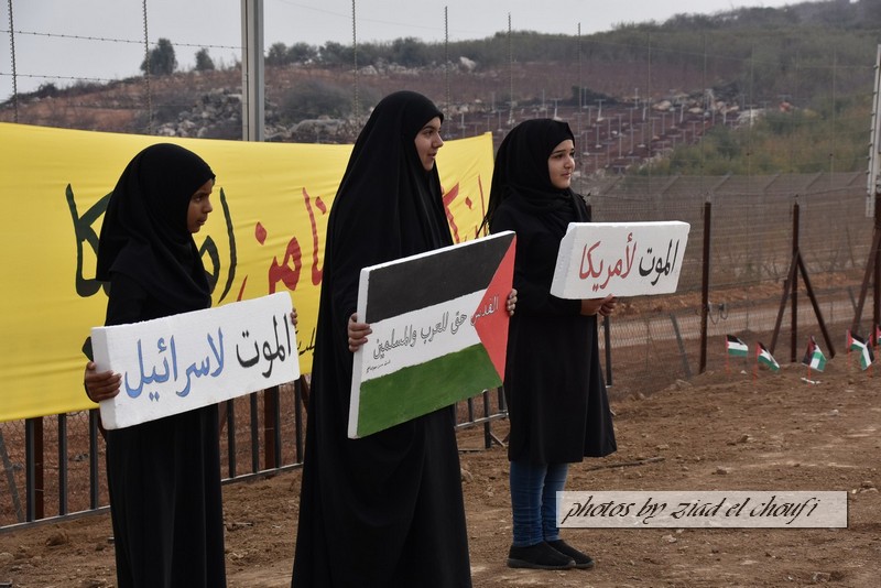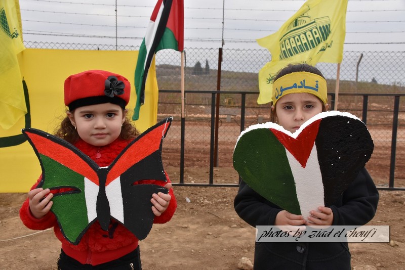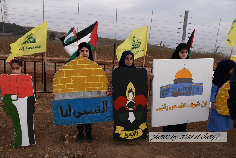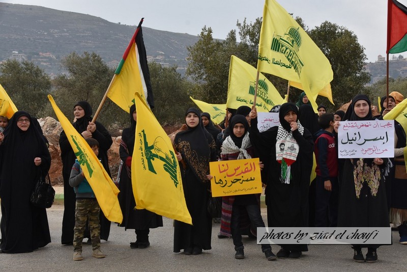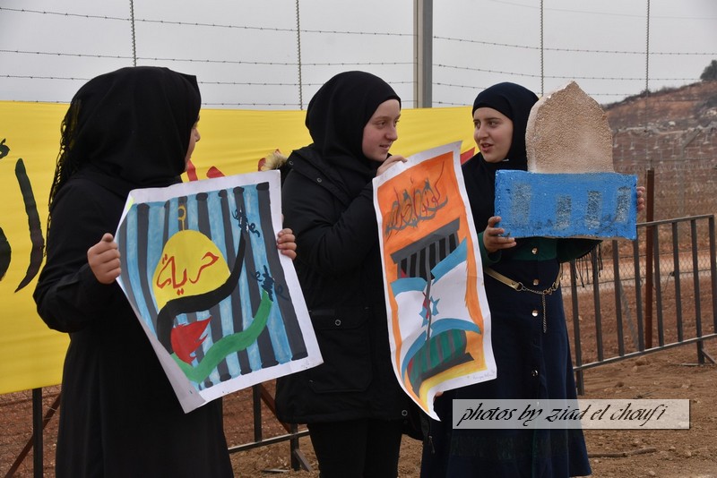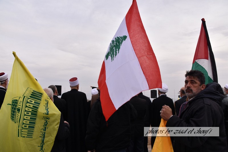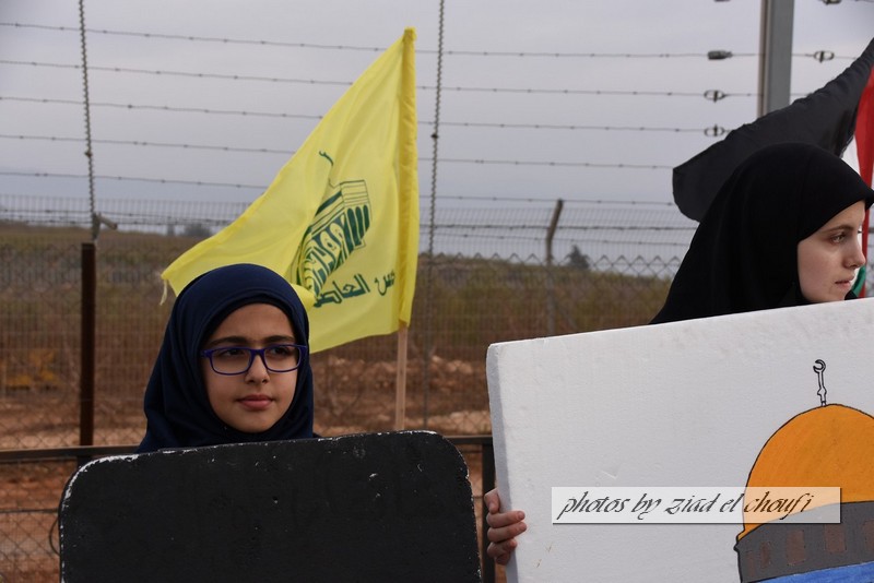 نظم حزب الله، وقفة تضامنية نصرة للاقصى والقدس، في كفركلا عند جدار فاطمة على الحدود بمحاذاة السياج التقني الفاصل بين لبنان والاراضي الفلسطينية المحتلة، بمشاركة فعاليات منطقتي مرجعيون وحاصبيا، احتجاجا على قرار الرئيس الاميركي دونالد ترامب بالاعتراف بالقدس عاصمة لكيان العدو الاسرائيلي، تقدمهم النائبان قاسم هاشم وعلي فياض، رجال دين من مختلف الطوائف، رؤساء بلديات ومخاتير المنطقة، ممثلون عن القوى والاحزاب السياسية، ووفود شعبية من قرى وبلدات المنطقة، والهيئات النسائية في حزب الله، وقد حمل المشاركون اعلام لبنان وفلسطين ورايات حزب الله والقدس ولافتات منددة بالقرار الاميركي كما هتفوا ضد اميركا واسرائيل واحرقوا علميهما.