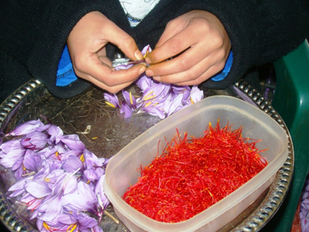 يعتبر نبات الزعفران من البصيلات وفصيلته من فصائل السوسنيات،وأهم جزء من أجزاء زهرة العضو الملقح والذي يكون لون أحمر ويسمى السمات ويتم إزالتها من الزهرة التي تم تفتحها، ويقوم المزارع بتجفيفها في مكان يتصف بالضل أو الفي ، على طبق كبير ورفيع على نار هادئة، هذه السمات التي لونها أحمر مائل إلى لون البرتقالي رائحتها زكي جداً ونفاذ وطعمها جداً لذيذ، نقوم بحفظها في أواني يجب أن تغلق بإستحكام لأنها مادة ثمينة جداً ويجب المحافظة عليها. تستخرج السمات ذات اللون الأحمر بشكل دقيق من زهرة وعلى يد شخص لديه خبرة بزعفران وإزالته من زهرة وتجميعها، الزعفران من النباتات المكلفة زراعياً فسعر الزعفران غالي جداً، ومن البلدان التي يتم زراعة الزعفران فيها إيران خصوصاً نوعية الزعفران الممتازة، وحتى نتمكن على ربع كيلو من الزعفران نحتاج إلة زراعة ثلاثمائة وخمسون ألف زهرة حتى يقوم المزارع بجمعها وعلاجها وتجفيفها، والزعفران بعد تجفيف يكون وزنه أقل من وزنه عند جمعه. عندما يتم زراعة البصلة فإنها تقوم بإنتاج ثمانية أوراق، فكل زهرة تنمو يكون فيها ثلاثة سبلات تحتوي أيضا على بتلات عددها ثلاثة، يكون لونها في البداية زهري يوجد فيها شعيرات لونها أصفر وسمات عددها أيضاً لونها أحمر، يكون السمات أطول من الشعيرات، فرائحة السمات القوية يجعل من زهرة الزعفران زهرة مثالية، يصنع من زعفران العديد من الأطعفة فيتم تلوين الأرز والجبنة والزبدة فيها ، كما يستخدم الزعفران أيضافي المشروبات الروحية الكحولية وغيرها، وأيضاً يتم تلوين المثلجات بها كالبوظة. كيف يتم زرع الزعفران ؟ يجب أن يتم إختيار جزء من أرض يوجد فيهاأشعة الشمس ساطعة وبإستمرار، وقبل الزراعة يجب أن نضيف على التربة بعض من الأسمدة ويفضل أن تكون عضوية، فتزرع الأبصال متقاربة من بعضها البعض وأن تكون المسافة بين البصلة والأخرة أحدى عشر سم، فإحتياج البيت يكون عشرون إلى خمسة وعشرون بصلة، والعمق الذي تحتاجهالبصلة في تربة عشرة سم ، يتم تكاثر بصيلات الزعفران سنة خلف سنة وتزهر بأزهار مستجدة. إذا كان هناك بعض المشاكل مثل وجود الفئران الحقل أو الخلد يجب محاولة زراعة الأبصال في أواني خارجية وليس في تربة الحديقة. الوقت الذي يزرع فيه الزعفران في آخر فصل الصيف، وزهرة الزعفران تنبت في أوائل فصل الخريف ومدة إستدامتها ثلاثة أسابيع ونصف، أما أوراق الزهرة تخرج من زهرة بعد فترة قصيرة وتدوم لمدة ثمانية أسابيع، وبعد هذه الفترات تقوم الزهرة وأوراقها بالإختفاء ولكن البصلة تبقى بالأرض، إلى أن يتم نموها في أول الخريف التالي ولكن يجب معرفة أين توجد البصلة حتى لايتم إزالتها لزراعة شيء آخر. يفضل حصاد سمات الزعفران في وقت الصباح، شريطة أن تكون الشمس ساطعة والأزهار متفتحة، وإزالة السمات بدقة متناهية ووضعها في مكان جاف تماماً، ومن بعد ذلك يمكن إستخدام الزعفران في الطبخ لإعطاء نكهة لذيذة وفريدة على الطعام.