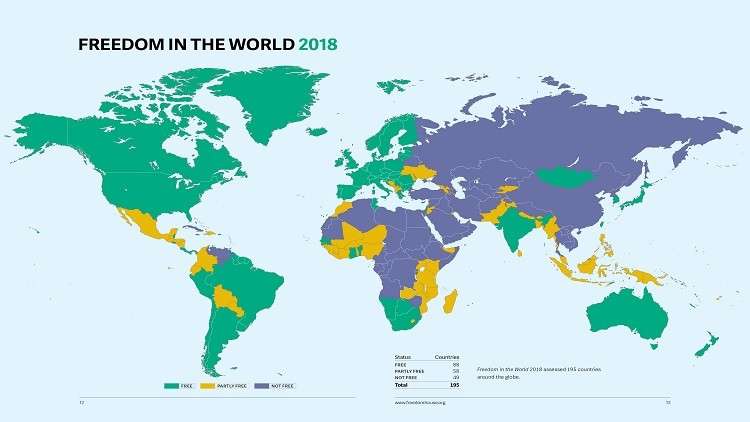 ووفقا لما ورد في التقرير أيضا، فإن 45 في المئة من دول العالم تم تصنيفها حرة، و30 بالمئة منها حرة نسبيا، أما الـ25 في المئة المتبقية من دول العالم فلا تتمتع بالحرية إطلاقا.