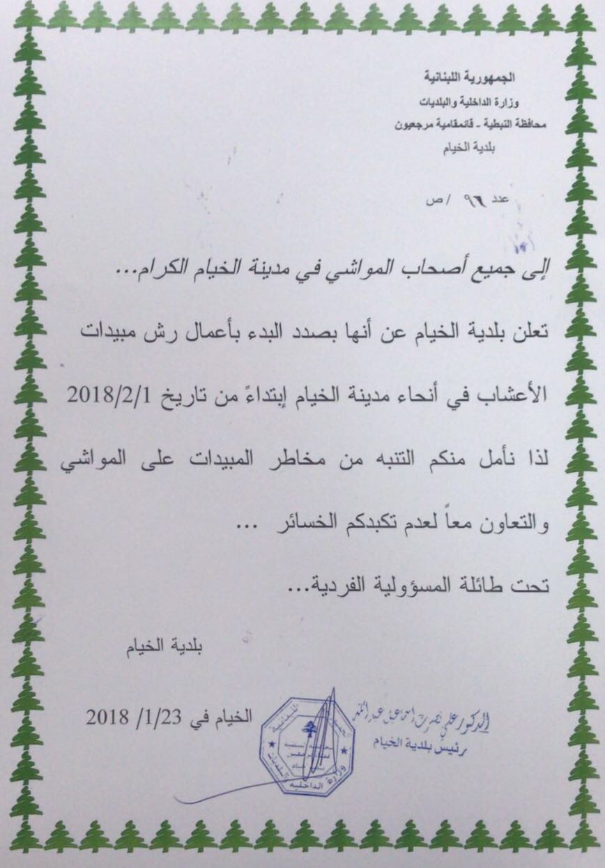 وقد توجهت البلدية لأصحاب المواشي لأخذ العلم والحيطة من مخاطر المبيدات على المواشي.