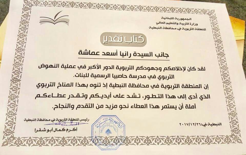 تقديراً لعملهم الدؤوب في إعلاء الشأن التربوي عبر تعزيز المدرسة الرسمية للبنات في حاصبيا ولنشاطاتهم المميزة مع الطلاب بإستخدام أساليب حديثة ومتطورة في عملية التربية والتعليم كرمت المنطقة التربوية في محافظة النبطية بشخص رئيس المنطقة الاستاذ أكرم ابو شقرا المعلمتان رانيا عماشة ومي أبو صالحة>