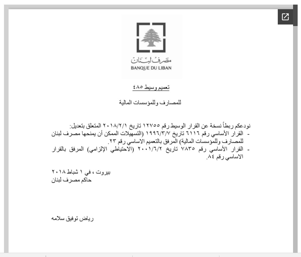 صدر عن مصرف لبنان المركزي، الجمعة في 2 شباط 2018، تعميم حمل الرقم 485 حدّد بموجبه آلية جديدة لمنح القروض الإسكانية والتجارية. كما أدخل تعديلات على الفوائد تمثلت بارتفاعها بنسبة تراوح بين 0.75% و1%.