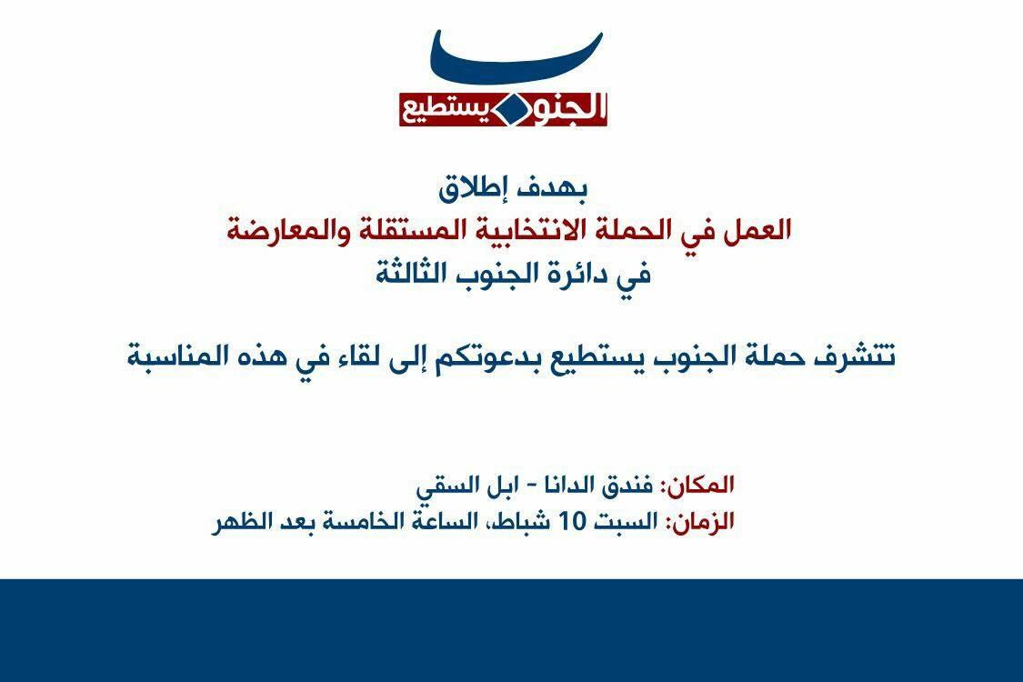 تحت عنوان «الجنوب يستطيع»، تداعت جرى توزيع دعوة إلى لقاء تقرر عند الخامسة عصر يوم السبت الموافق 10 شباط 2018، في فندق «الدانا» في إبل السقي، لإطلاق العمل في الحملة الإنتخابية النيابية في دائرة الجنوب الثالثة.