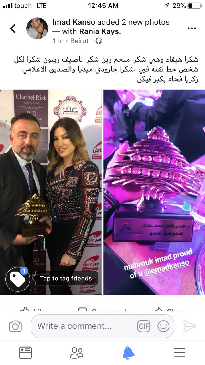 وجاء ردّ عماد، سريعاً على صفحته على الفايسبوك، على الذين ساهموا بتكريمة بالكلمات التالية: