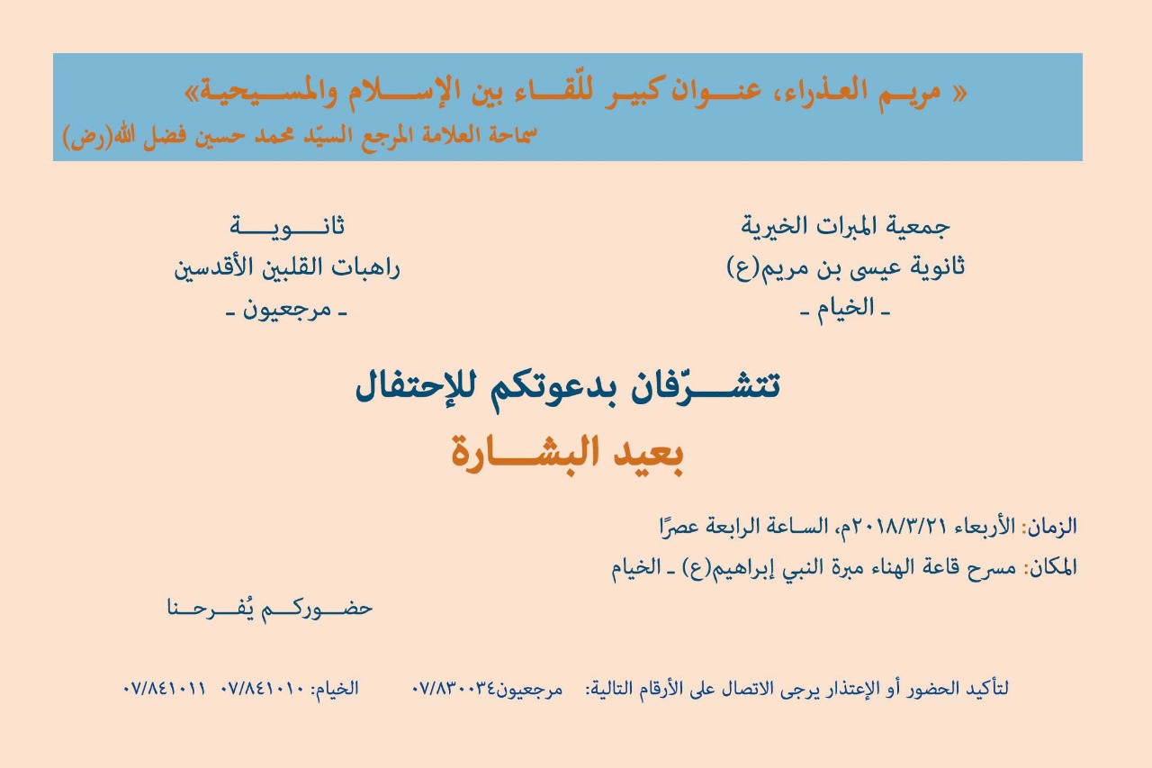 تحيي ثانوية عيسى بن مريم(ع) بالتعاون مع ثانوية راهبات القلبين الأقدسين في مرجعيون عيد البشارة في حفل مشترك يقام في الخيام حيث اللقاء السنوي يتجدّد للتأكيد على أهمية الوحدة بين الطوائف ونشر المحبة وتعاليم الأنبياء، بحضور فعاليات دينية وتربوية وبلدية وأمنية واجتماعية.