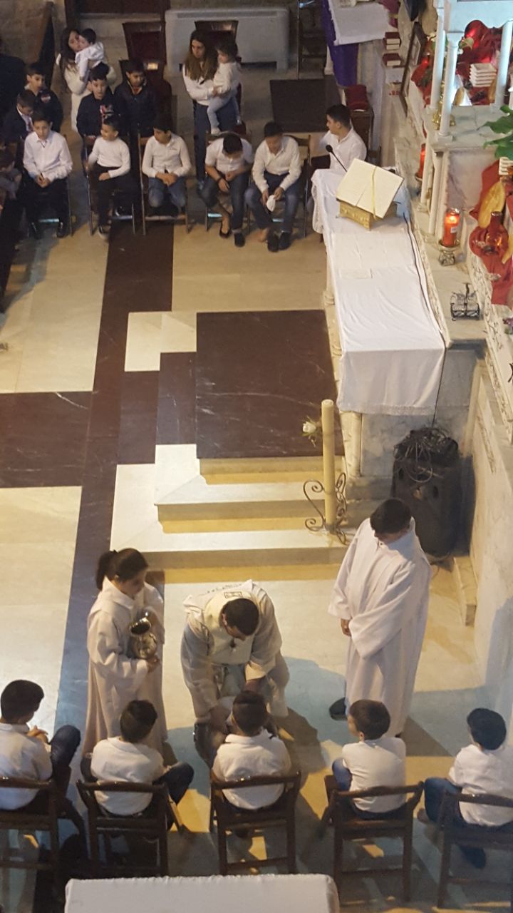 وبعد الإنجيل المقدس ، قام الأب فرح برتبة الغسل وغسل أرجل 12 طفلاً، تجسيداً لما قام به السيد المسيح مع تلاميذه ، حيث غسل أرجل تلاميذه ال 12 وقبّلها رمزاً للتواضع والمحبة.