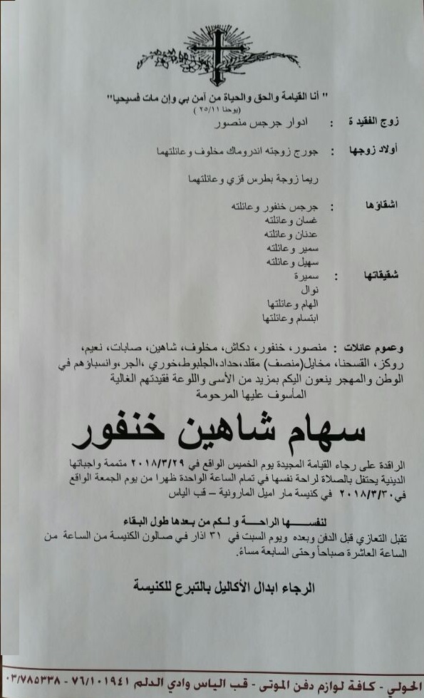 يحتفل بالصلاة لراحة نفس الفقيدة المأسوف عليها سهام شاهين خنفور الساعة الواحدة من ظهر يوم غد الجمعة 30 آذار 2018 في كنيسة مار اميل المارونية - قب الياس