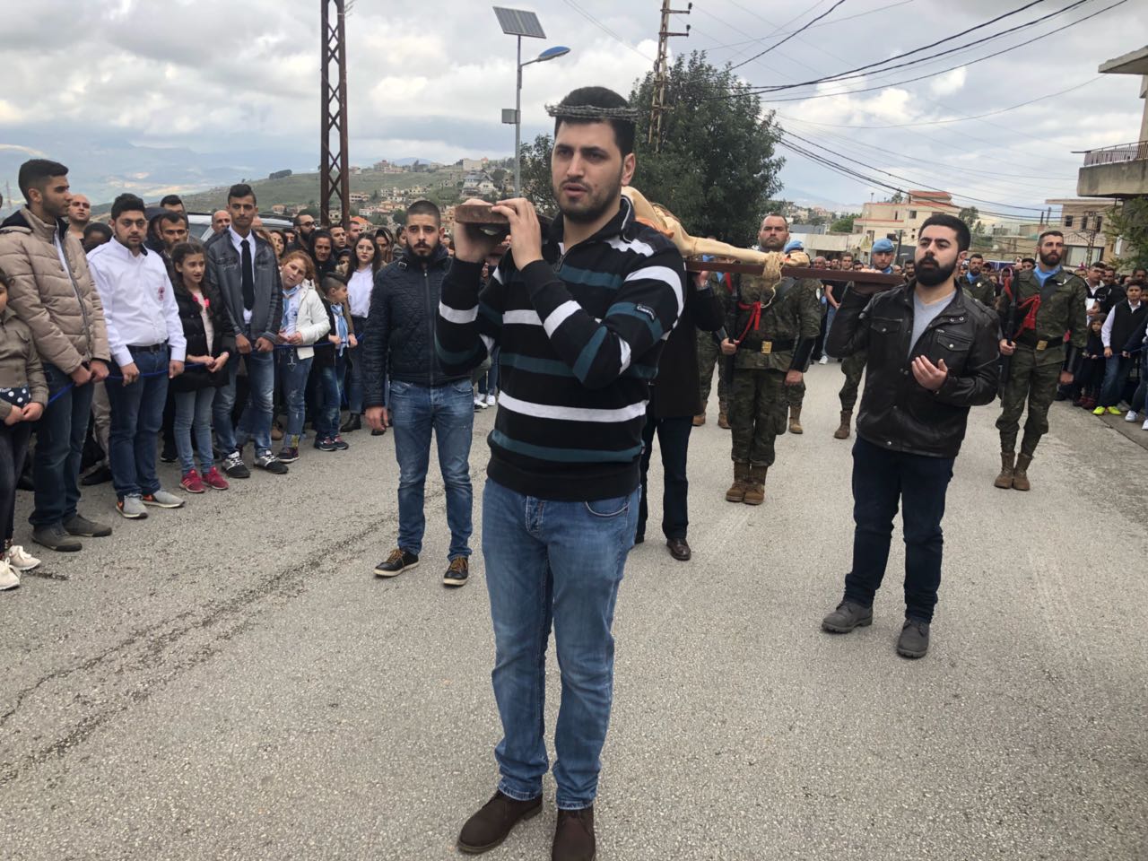 وشارك المؤمنون بتطواف الصليب، فجابوا الأحياء والشوارع الداخلية للبلدة، لإحياء آلام السيد المسيح، يتقدمهم كاهن الرعية الأب حنا الخوري والأب شربل برقاشي، على وقع التراتيل وموسيقى الفرقة الأسبانية. وتوجهت المسيرة إلى الكنيسة الإنجيلية الوطنية وسط البلدة، ومنها إلى كنيسة القديس جاورجيوس للروم الأورثوذكس، ثم انتقلت إلى كاتدرائية القديس بطرس للروم الكاثوليك، واختتمت مراحل آلام السيد المسيح في كنيسة سيدة الخلاص المارونية برتبة دفن المصلوب.