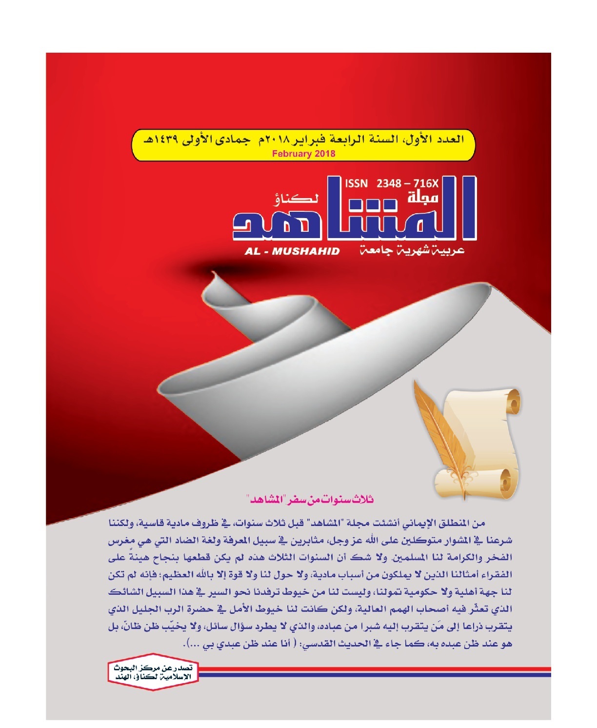 عن مركز البحوث الإسلامية في لكناؤ/الهند صدر العدد الأوّل للسّنة الرّابعة للعام 2018 من مجلة المشاهد الناطقة باللّغة العربيّة، ويرأس تحريرها الدكتور أنوار أحمد البغدادي، ويدير تحريرها د.محمد معراج الحق البغدادي، ويساعد في تحريرها الأستاذ محمد نعيم مصباحي، والأستاذ محمد ذكي الله المصباحي، ومسؤول الإدارة الأستاذ محمد عظيم الأزهري،ومسؤول التوزيع الأستاذ محمد عظيم الأزهري .في حين يرأس الهيئة العلميّة فيها الأديبة الدكتورة سناء الشعلان من الأردن،وتتكوّن هذه اللجنة العلميّة من كلّ من:د.سيد عليم أشرف الجائسي،والدكتور سعيد بن مخاشن،والشيخ ياسين أختر المصباحي،والشيخ محمد مختار الحسن البغدادي.