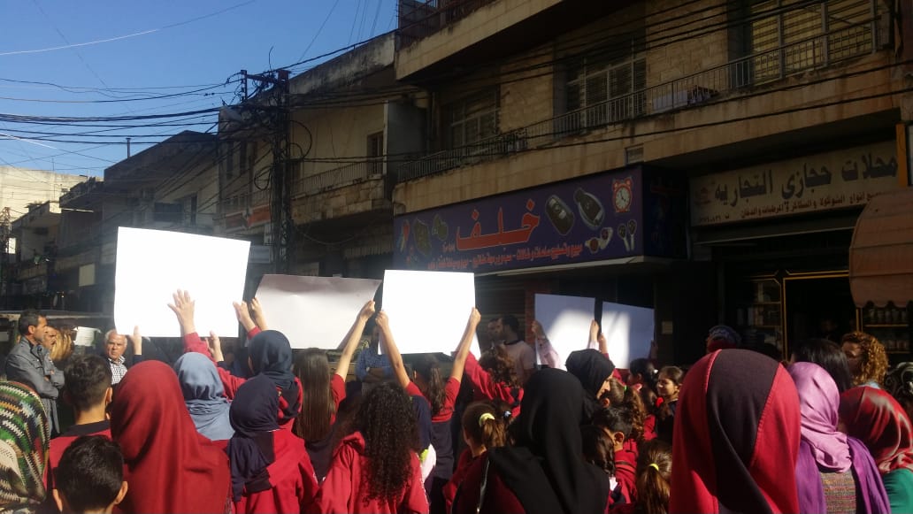 ورفع عدد من الطلاب لافتات كتب على بعضها: "ادارة مدرستي: انصفي استاذي لأكمل عامي"، و" لم نتأخر يوما عن دفع الزيادات المحقة صونا لحقوق معلمينا على مدى 5 سنوات، اعطوا الحقوق لاصحابها واكملوا عام اولادنا" و" رفاقي يتعلمون اساتذتي يتأملون والادارة نائمون".