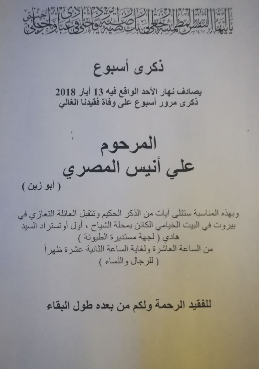 بهذه المناسبة يقام مجلس عزاء عن روحه الطاهرة من العاشرة صباحاً لغاية الثانية عشرة ظهراً في البيت الخيامي في بيروت – مستديرة شاتيلا.