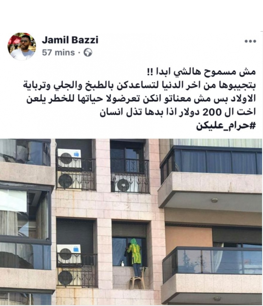 نشر الناشط جميل بزّي صورة لعاملة اجنبية تقوم بتنظيف الزجاج الخارجي لشقة سكنية في محلة السان تيريز بالضاحية وتظهر انها تعمل بطريقة تشكل فيها خطر على حياتها. و استنكر رواد التواصل الاجتماعي محتوى الصورة كونه يعرض حياة العاملة للخطر الحقيقي وطالب المعلقون تدخل وزارة العمل للحد من هذه الاعمال واستغلال العاملات الاجنبيات بطرق غير مقبولة والتحقيق بالموضوع.
