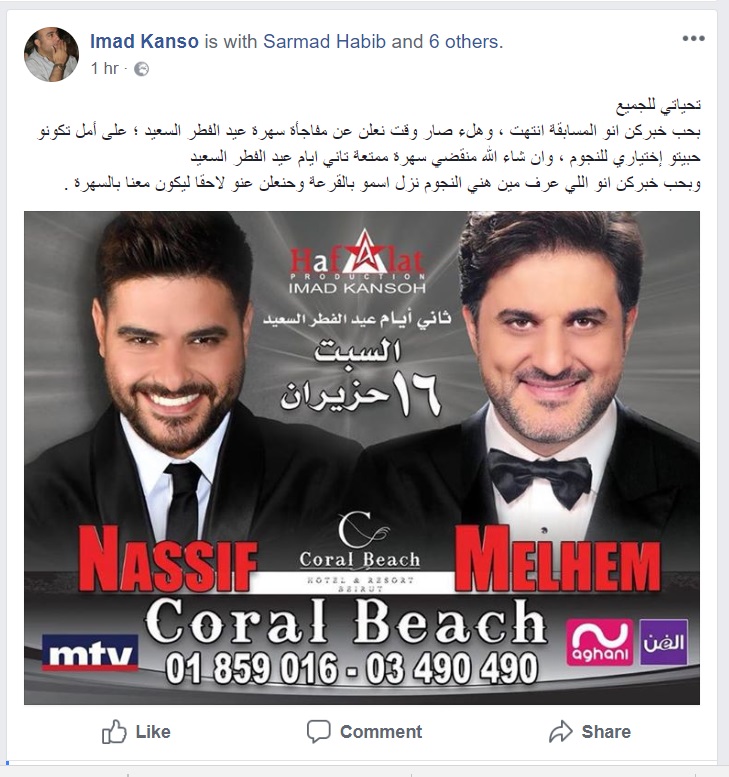 لمناسبة عيد الفطر السعيد، ينظم المنتج ومتعهد الحفلات الصديق عماد قانصو، حفلاً فنياً ضخماً من إنتاج شركة حفلات برودكشن، في في فندق ومنتجع كورال بيتش بيروت (Coral Beach Hotel & Resort Beirut)، يحييه نجمان من بين اهم الاسماء في عالم الفن، الفنانان ملحم زين وناصيف زيتون وذلك مساء يوم السبت الموافق 16 حزيران 2018.