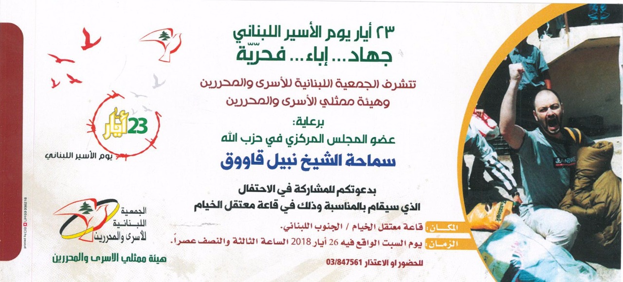 دعت الجمعية اللبنانية للأسرى والمحررين وهيئة ممثلي الأسرى والمحررين للمشاركة في الإحتفال الذي سيقام بمناسبة "يوم الأسير اللبناني" وذلك في قاعة معتقل الخيام.