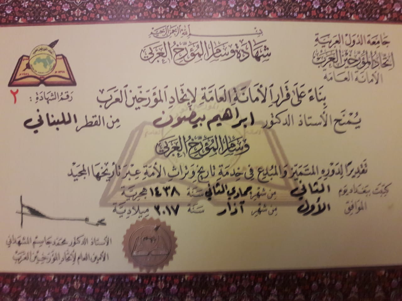 منح اتحاد المؤرخين العرب التابع لجامعة الدول العربية البروفيسور ابراهيم بيضون شهادة وسام المؤرخ العربي، وذلك تكريماً لمساهماته العديدة في مجال التأريخ والعلوم الإنسانية، وتقديراً لدوره العلمي في خدمة تأريخ التراث العربي.