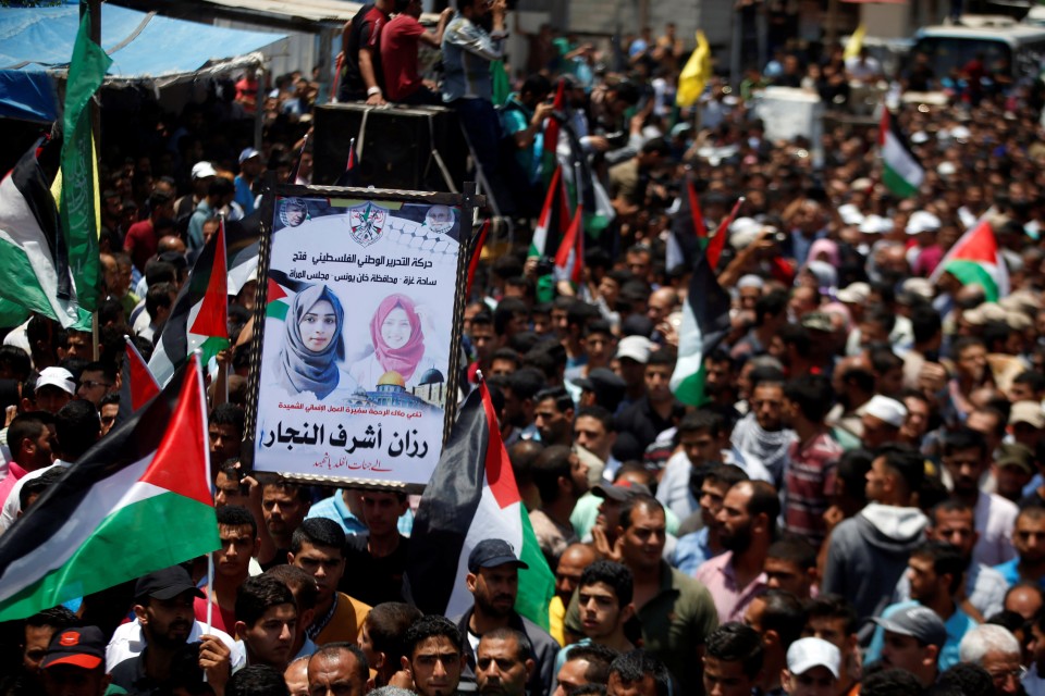 شيّع آلاف الفلسطينيين، ظهر السبت، جثمان الشهيدة المُسعفة رزان النجار (21عامًا)، في بلدة خزاعة الحدودية، جنوبي قطاع غزة.