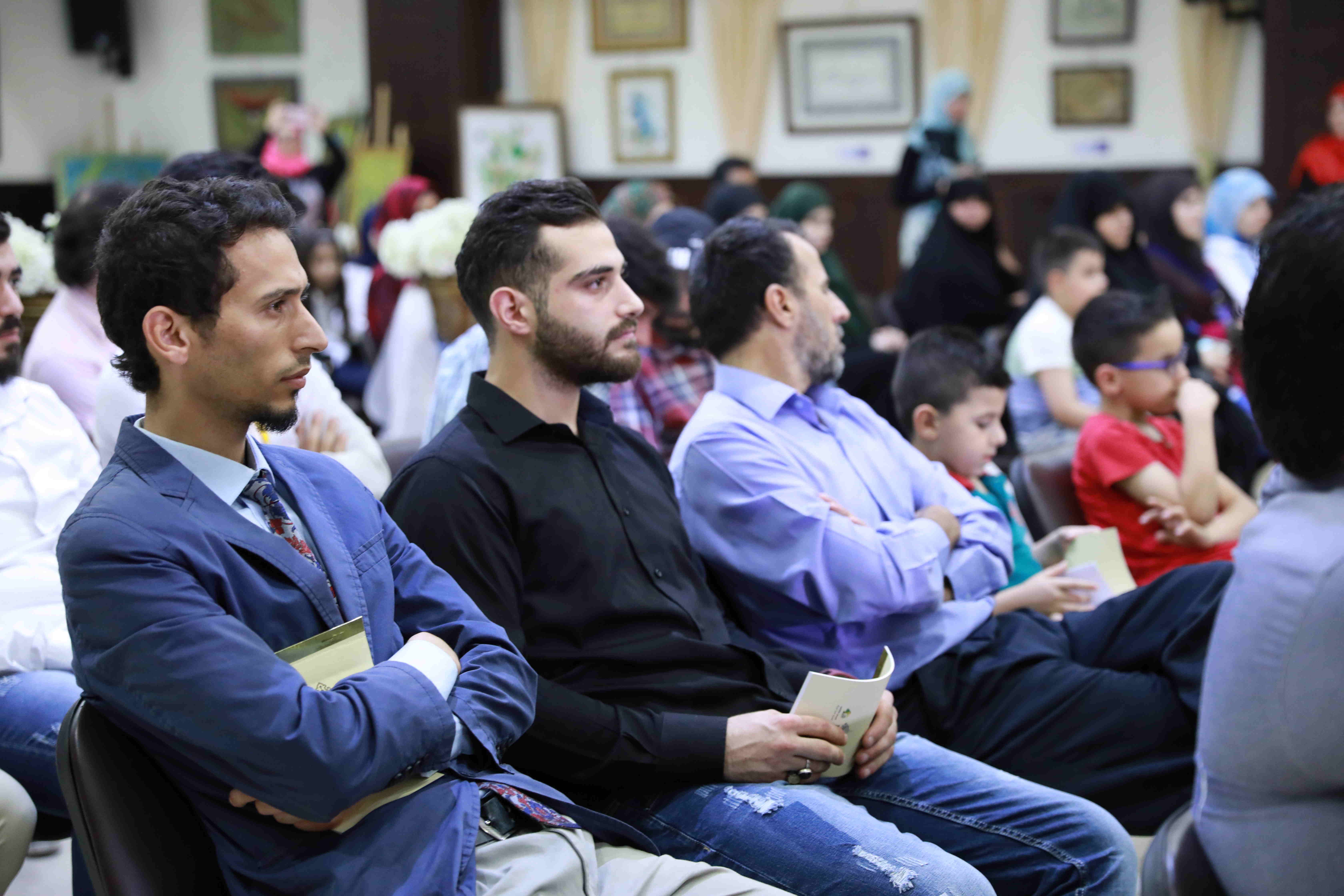 وقد بدأ الحفل بآيات من الذكر الحكيم تلاها النشيد الوطني وكلمة لنائب رئيس بلدية حارة حريك الأستاذ أحمد حاطوم، الذي أعرب عن تعليق الآمال على الجيل الصاعد "أجيال مختلفة تلتقلي وهذا ما يبعث على السرور..ثمة نماذج واعدة في الفن والشعر والأدب"، أما كلمة ابداع -وهي من نظم الحفل بالتعاون مع بلدية الحارة وجمعية الخطاطين اللبنانين- فقد ابدى خلالها رئيس جمعية ابداع الأستاذ علي عباس خالص الشكر لكل المشاركين، معلنا عن افتتاح سلسلة ورش مجانية لتعلُم الخط والزخرفة.