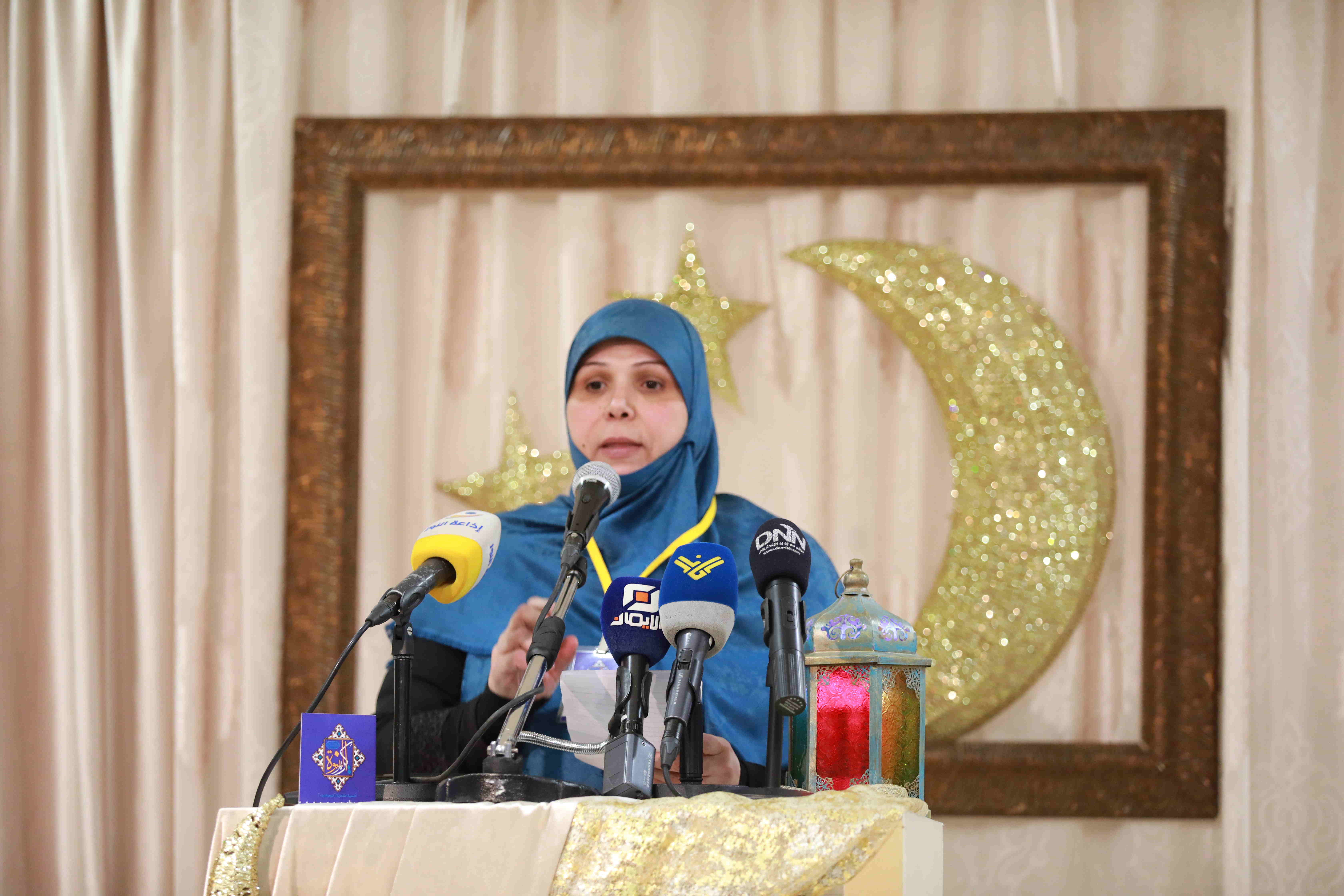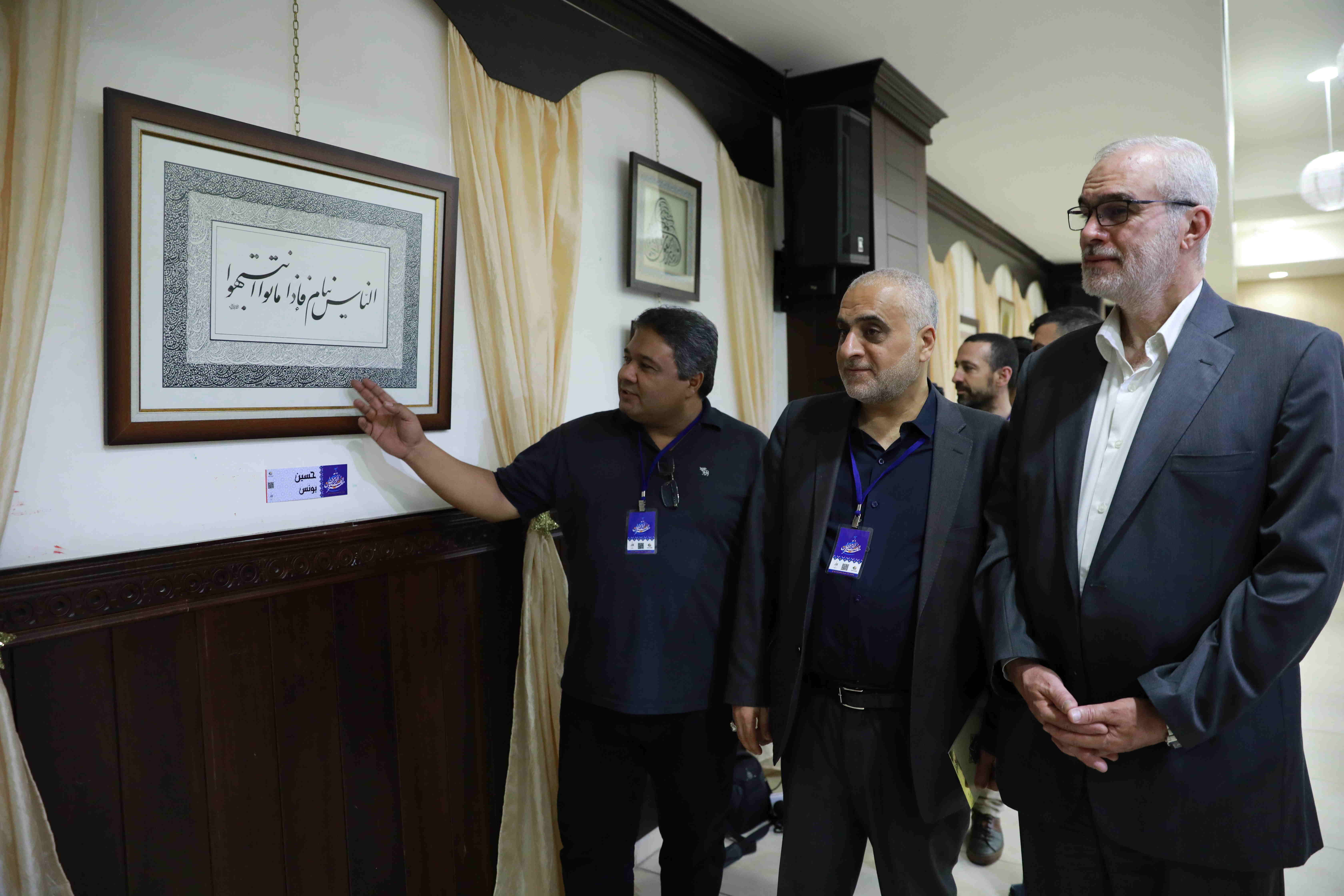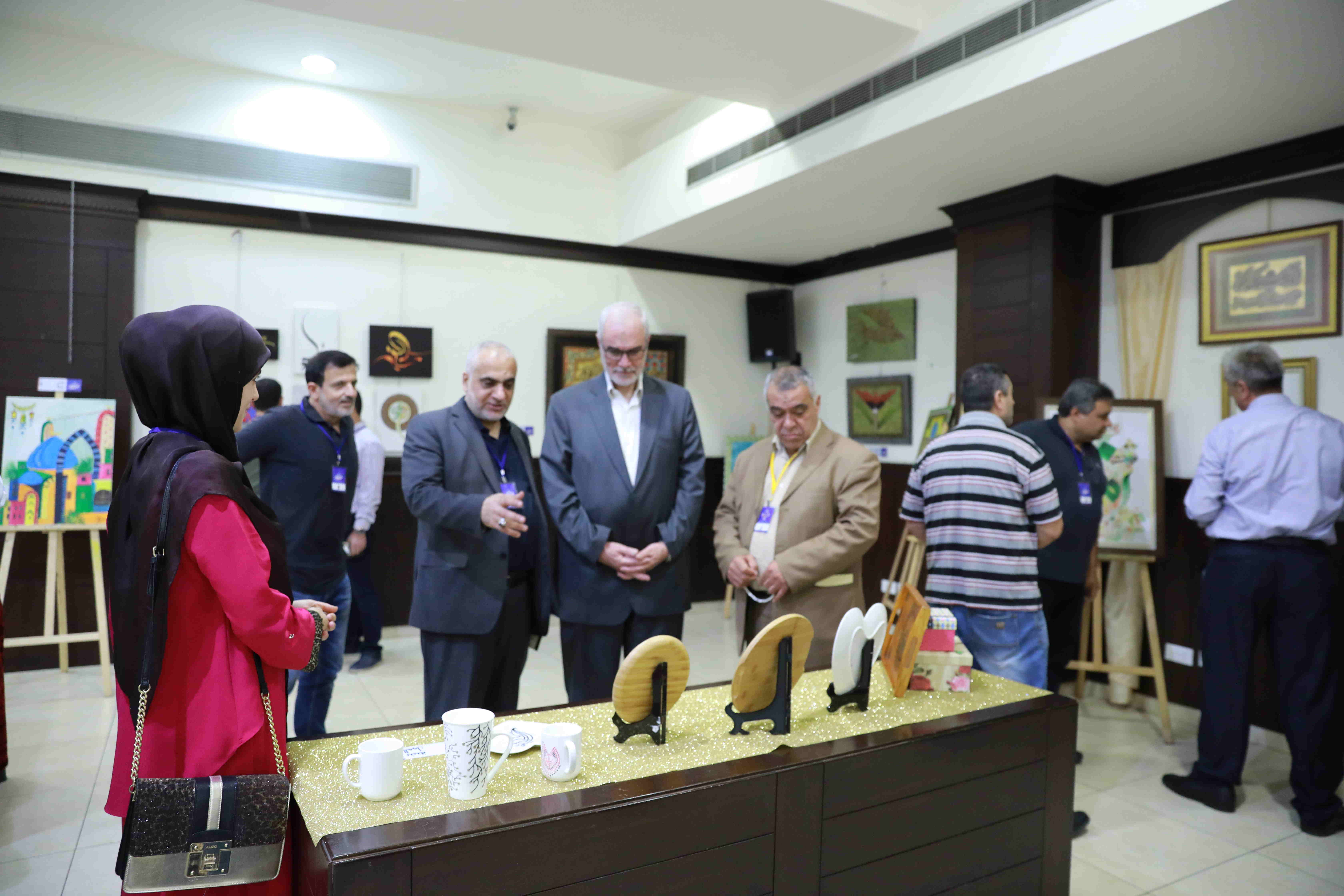 هذه اللوحات المنتشرة في الشق الأيمن من المعرض تتكامل مع لوحات أخرى عن شماله تحوي مخطوطات عربية، حيت تزخر اللوحات بالايات القرانية والزخارف بالخط العربي التي لك أن تتيه في جمال خطوطها المنسابة والمتناسقة. وفي منتصف المعرض هلال ونجمة يتوسطان منصة التكريم في حين تنتشر الموسيقى الرمضانية في الارجاء، وتتلالا الفوانيس في المعرض في جو روحي ورونق رمضاني جميل.