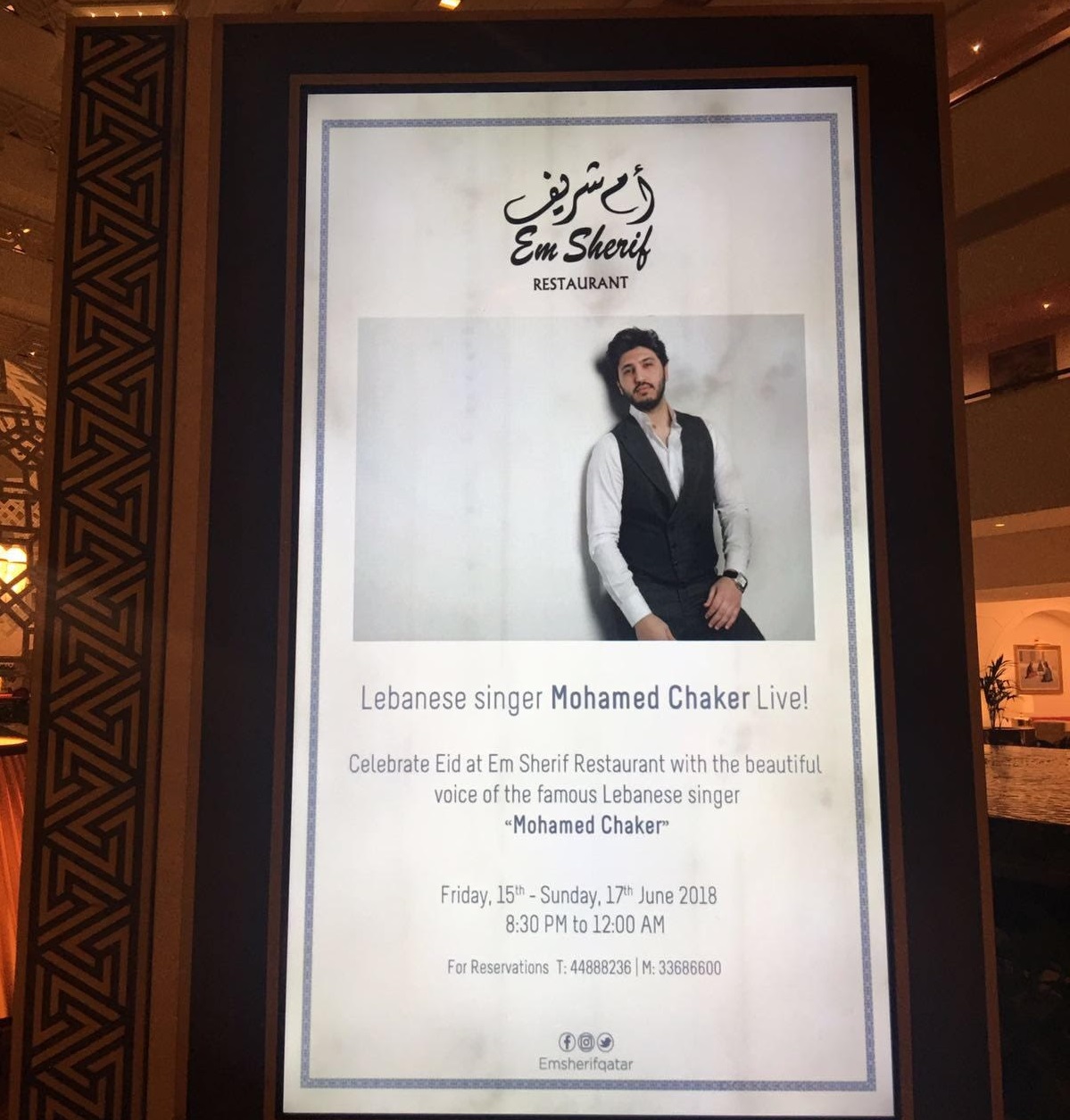 يستقبل الفنان اللبناني محمد فضل شاكر عيد الفطر السعيد في العاصمة القطرية الدوحة، اذ يحيّ بمناسبة العيد ثلاث حفلات في مطعم "أم شريف" في فندق "شيراتون" الدوحة مساء 15 و 16 و 17 حزيران/ يونيو الحالي، ويقدم خلال الحفلات اغنياته الخاصة، اضافة الى مجموعة من اغنيات والده النجم فضل شاكر، ومجموعة منوعة من الاغنيات الطربية.